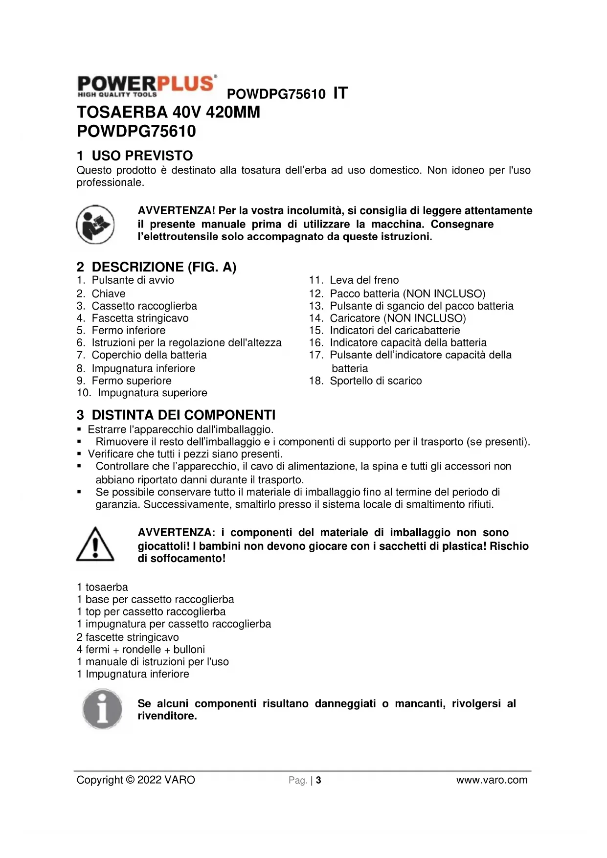 - Se possibile conservare tutto il materiale di imballaggio fino al termine del periodo di garanzia. Successivamente, smaltirlo presso il sistema locale di smaltimento rifiuti. AVVERTENZA: i componenti del materiale di imballaggio non sono giocattoli! I bambini non devono giocare con i sacchetti di plastica! Rischio di soffocamento! 1 tosaerba 1 base per cassetto raccoglierba 1 top per cassetto raccoglierba 1 impugnatura per cassetto raccoglierba 2 fascette stringicavo 4 fermi + rondelle + bulloni 1 manuale di istruzioni per l'uso 1 Impugnatura inferiore Se alcuni componenti risultano danneggiati o mancanti, rivolgersi al rivenditore.POWDPG75610 IT Copyright © 2022 VARO Pag. | 4 www.varo.com 4 SIMBOLI Nel presente manuale e/o sulla macchina sono utilizzati i seguenti simboli: