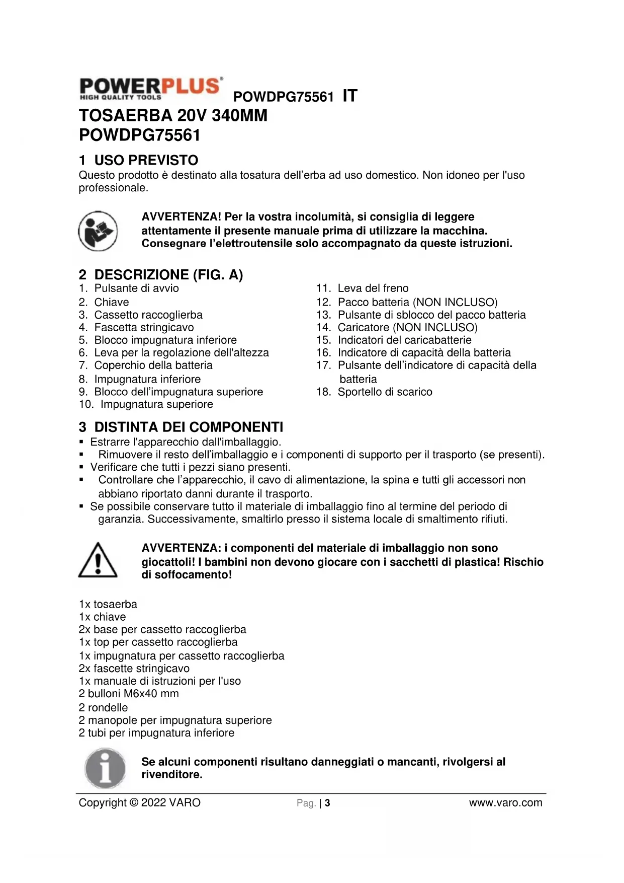- Prestare particolare attenzione durante l'inversione di direzione del tosaerba e quando lo si tira verso di sé. Non avviare il motore se il sacco raccoglierba non è presente.POWDPG75561 IT Copyright © 2022 VARO Pag. | 7 www.varo.com