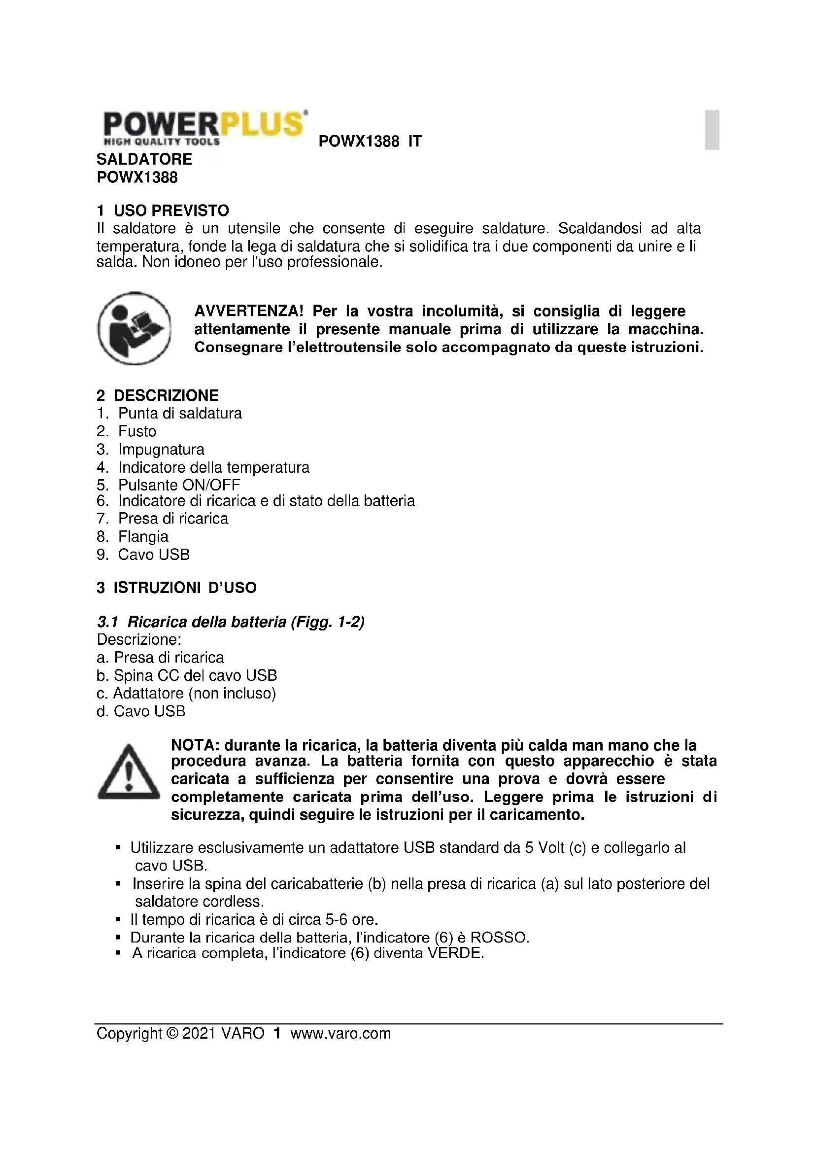 Afferrare il saldatore alla base dell’impugnatura (3) e appena sopra la flangia (8) come se fosse una penna. AVVERTENZA: non toccare mai il fusto (2) o la punta (1) in quanto possono raggiungere temperature fino a 400 °C. Tenere il saldatore con la punta a contatto con il pezzo da lavorare per alcuni secondi, per permetterne il riscaldamento. Applicare lentamente la lega di saldatura sulla giunzione e lasciarla fondere. Una volta applicata la lega di saldatura sulla giunzione, mantenere fermo il pezzo da lavorare rimuovendo al contempo la lega di saldatura e il saldatore. NOTA: una buona giunzione ha un aspetto liscio e lucido. Se così non fosse, è necessario scaldare nuovamente la giunzione e riapplicare la lega di saldatura. NOTA: la punta di saldatura è progettata per durare molto a lungo e pertanto non è necessario sostituirla se l’apparecchio viene utilizzato normalmente.POWX1388 PT Copyright © 2021 VARO 1 www.varo.com