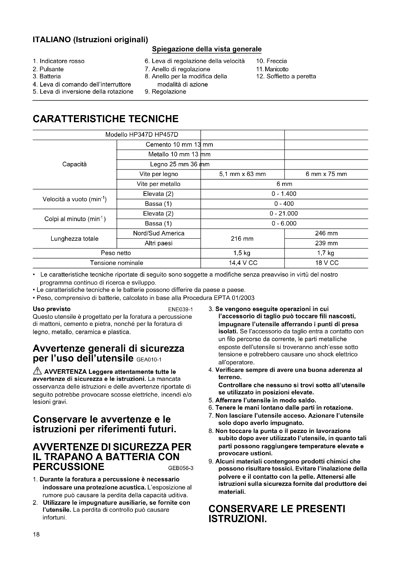 - Peso, comprensivo di batterie, calcolato in base alla Procedura EPTA 01/2003 Uso previsto ENE039-1 Questo utensile è progettato per la foratura a percussione di mattoni, cemento e pietra, nonché per la foratura di legno, metallo, ceramica e plastica. Avvertenze generali di sicurezza per l’uso dell’utensile GEA010-1 AVVERTENZA Leggere attentamente tutte le avvertenze di sicurezza e le istruzioni. La mancata osservanza delle istruzioni e delle avvertenze riportate di seguito potrebbe provocare scosse elettriche, incendi e/o lesioni gravi. Conservare le avvertenze e le istruzioni per riferimenti futuri.