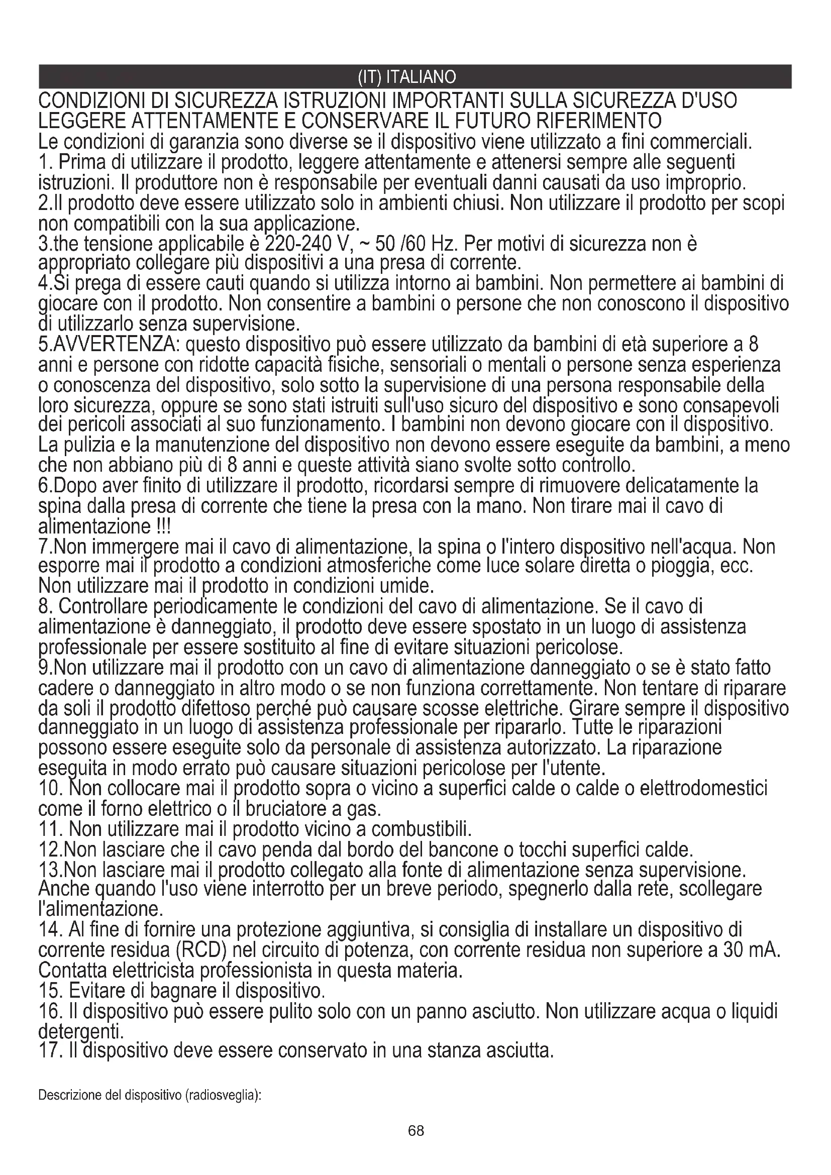istruzioni. Il produttore non è responsabile per eventuali danni causati da uso improprio. 2.Il prodotto deve essere utilizzato solo in ambienti chiusi. Non utilizzare il prodotto per scopi non compatibili con la sua applicazione. 3.the tensione applicabile è 220-240 V, ~ 50 /60 Hz. Per motivi di sicurezza non è appropriato collegare più dispositivi a una presa di corrente. 4.Si prega di essere cauti quando si utilizza intorno ai bambini. Non permettere ai bambini di giocare con il prodotto. Non consentire a bambini o persone che non conoscono il dispositivo di utilizzarlo senza supervisione. 5.AVVERTENZA: questo dispositivo può essere utilizzato da bambini di età superiore a 8 anni e persone con ridotte capacità fisiche, sensoriali o mentali o persone senza esperienza o conoscenza del dispositivo, solo sotto la supervisione di una persona responsabile della loro sicurezza, oppure se sono stati istruiti sull'uso sicuro del dispositivo e sono consapevoli dei pericoli associati al suo funzionamento. I bambini non devono giocare con il dispositivo. La pulizia e la manutenzione del dispositivo non devono essere eseguite da bambini, a meno che non abbiano più di 8 anni e queste attività siano svolte sotto controllo. 6.Dopo aver finito di utilizzare il prodotto, ricordarsi sempre di rimuovere delicatamente la spina dalla presa di corrente che tiene la presa con la mano. Non tirare mai il cavo di alimentazione !!! 7.Non immergere mai il cavo di alimentazione, la spina o l'intero dispositivo nell'acqua. Non esporre mai il prodotto a condizioni atmosferiche come luce solare diretta o pioggia, ecc. Non utilizzare mai il prodotto in condizioni umide.