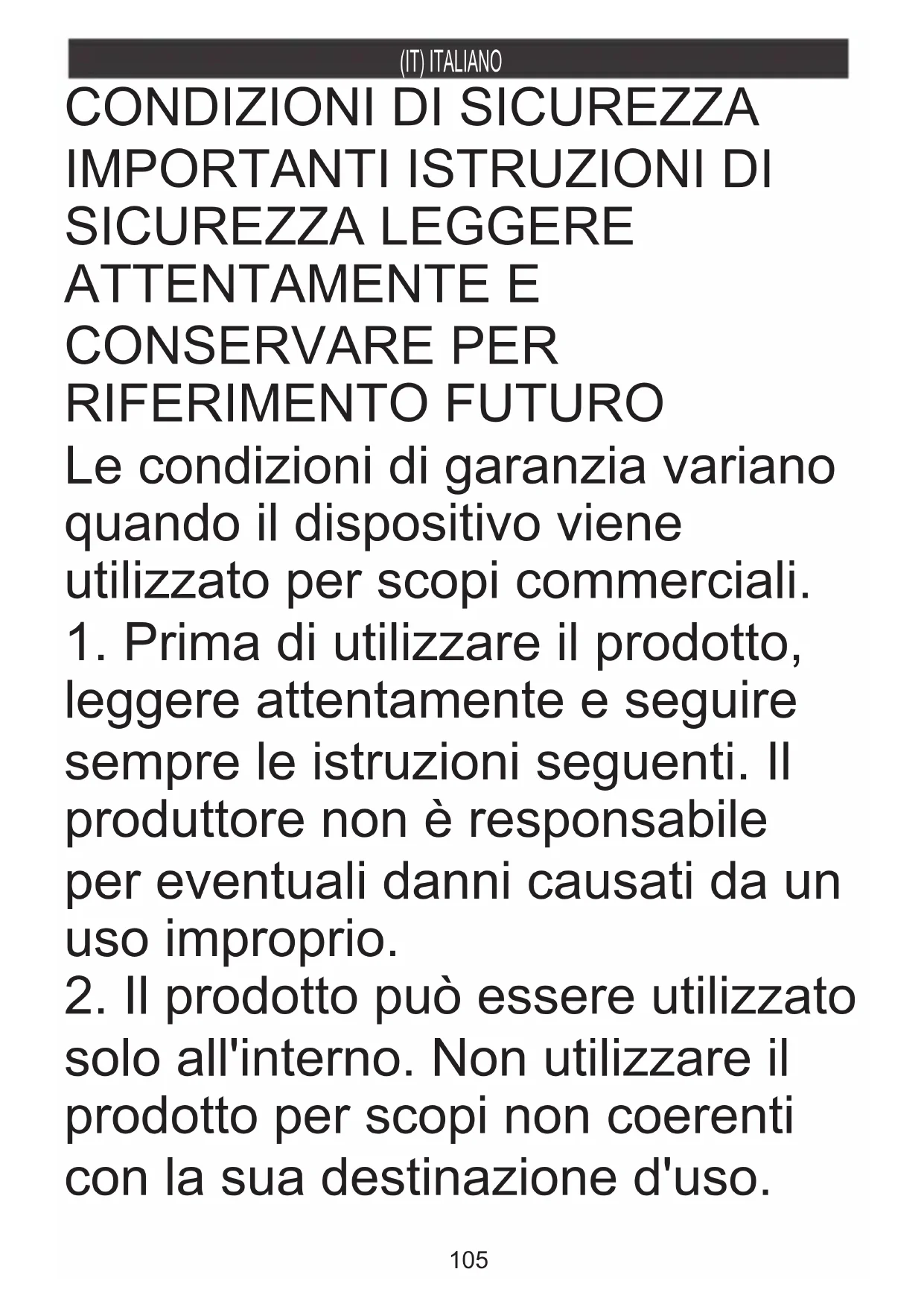 SICUREZZA LEGGERE ATTENTAMENTE E CONSERVARE PER RIFERIMENTO FUTURO Le condizioni di garanzia variano quando il dispositivo viene utilizzato per scopi commerciali.