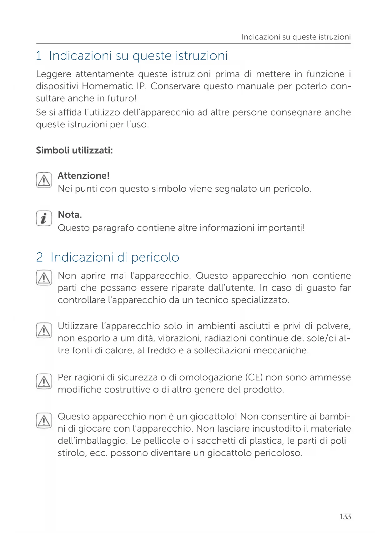 - 13 Dati tecnici 33 Indicazioni su queste istruzioni 1 Indicazioni su queste istruzioni Leggere attentamente queste istruzioni prima di mettere in funzione i dispositivi Homematic IP. Conservare questo manuale per poterlo con- sultare anche in futuro! Se si ada l’utilizzo dell’apparecchio ad altre persone consegnare anche queste istruzioni per l’uso. Simboli utilizzati: Attenzione! Nei punti con questo simbolo viene segnalato un pericolo. Nota. Questo paragrafo contiene altre informazioni importanti! 2 Indicazioni di pericolo Non aprire mai l'apparecchio. Questo apparecchio non contiene parti che possano essere riparate dall’utente. In caso di guasto far controllare l'apparecchio da un tecnico specializzato. Utilizzare l’apparecchio solo in ambienti asciutti e privi di polvere, non esporlo a umidità, vibrazioni, radiazioni continue del sole/di al- tre fonti di calore, al freddo e a sollecitazioni meccaniche. Per ragioni di sicurezza o di omologazione (CE) non sono ammesse modifiche costruttive o di altro genere del prodotto. Questo apparecchio non è un giocattolo! Non consentire ai bambi- ni di giocare con l’apparecchio. Non lasciare incustodito il materiale dell’imballaggio. Le pellicole o i sacchetti di plastica, le parti di poli- stirolo, ecc. possono diventare un giocattolo pericoloso.134 Funzioni e vista d'insieme dell'apparecchio L’azienda declina qualsiasi responsabilità per danni a cose o persone causati da un utilizzo improprio o dalla mancata osservanza delle indicazioni di pericolo. In casi simili decade il diritto alla garanzia! Si declina qualsiasi responsabilità per danni indiretti! Questo dispositivo è destinato esclusivamente all’uso in ambienti residenziali, commerciali e dell’industria leggera. Tenere presente che la regolazione della temperatura mediante il termostato per radiatori è progettata su un sistema di riscaldamento a due tubi con una tubazione di mandata e una di ritorno per cia- scun radiatore. L’uso in sistemi a tubo singolo può provocare signi- ficative dierenze rispetto alla temperatura impostata a causa di oscillazioni della temperatura di mandata. Qualsiasi impiego diverso da quello descritto nelle presenti istruzio- ni per l’uso non è conforme alle disposizioni e comporta l’esclusione di responsabilità e la perdita dei diritti di garanzia. 3 Funzioni e vista d'insieme dell'apparecchio Il dispositivo Homematic IP Termostato per radiatori consente di regolare la temperatura ambiente della casa smart con comandi temporizzati in base alle esigenze. Tramite profili di riscaldamento da configurare si pos- sono facilmente impostare temperature personalizzate. Grazie al design dell’alloggiamento a prova di manomissione con la pos- sibilità di apporre un sigillo e grazie al blocco integrato dei comandi con assegnazione di un PIN personale, il termostato è protetto da operazioni indesiderate. La copertura anti-smontaggio inclusa nella fornitura garan- tisce una maggiore sicurezza. Il termostato per radiatori può essere configurato direttamente sull’appa- recchio e adattato alle proprie esigenze personali. In alternativa, se col- legato a un Access Point Homematic IP, il termostato per radiatori può essere comodamente comandato dall’app per smartphone Homematic IP fornita gratuitamente. Collegato con il sistema Homematic IP Contatto per Finestre e Porta, il135 Funzioni e vista d'insieme dell'apparecchiotermostato abbassa automaticamente la temperatura quando si arieggia il locale, così non si spreca energia. Il termostato per radiatori è adatto a tutte le valvole per caloriferi attual-mente in uso e si installa facilmente poiché non è necessario scaricare acqua dal calorifero né intervenire sul sistema di riscaldamento. Vista d'insieme dell’apparecchio (v. figura 1): (A) Dado di metallo(B) Display LC(C) Tasto Più(D) Tasto Menu/Boost e LED dell’apparecchio(E) Tasto Meno(F) Coperchio del vano batterieVista generale display (v. figura 2): PrgOffsetAUTOMANUBOOST Mo Tu We Th Fr Sa Su p. 1601