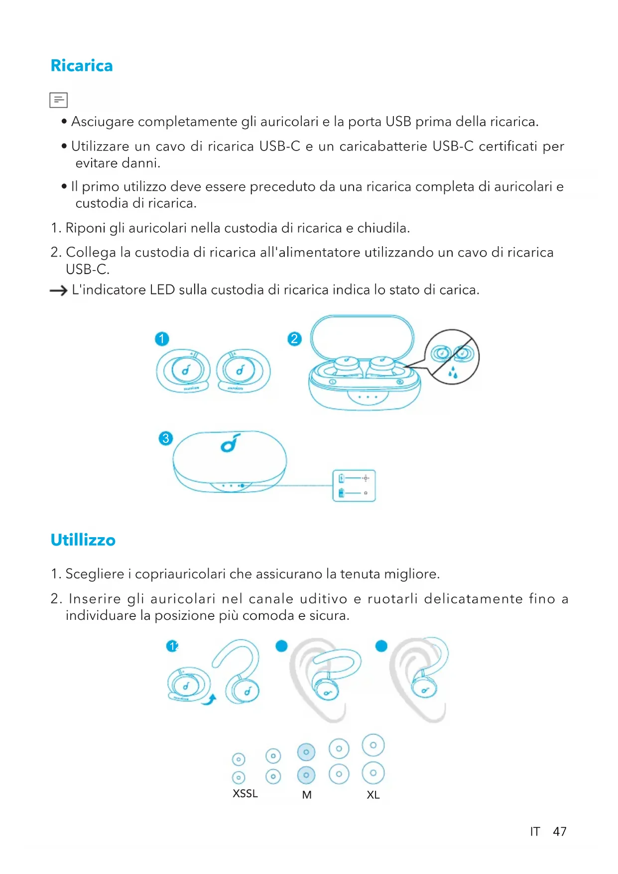 - Asciugare completamente gli auricolari e la porta USB prima della ricarica.