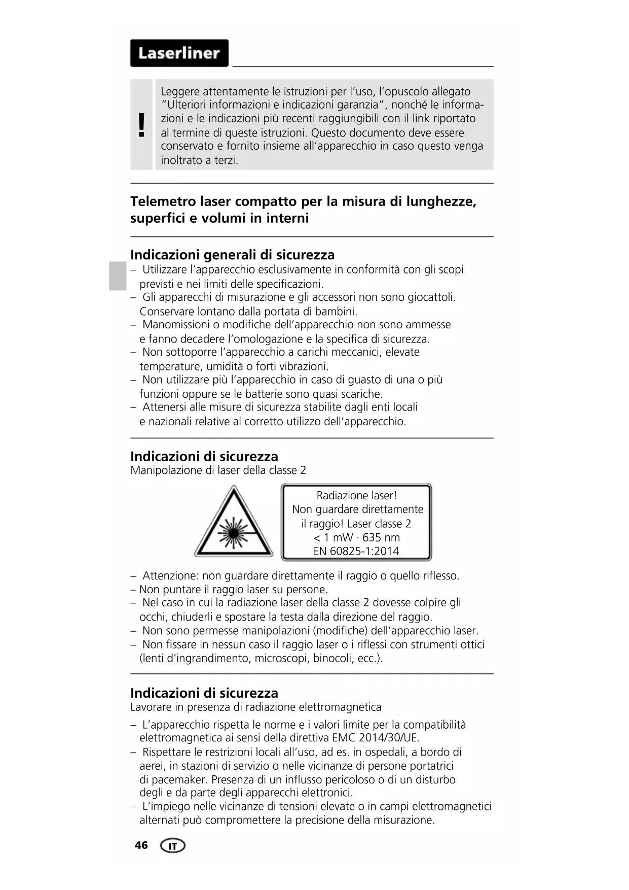 Datos Técnicos (Salvo modificaciones. 17W51) Gama de medición interiores 0,2 m - 70 m Precisión (típico)* ± 0,2 mm / m Clase de láser 2 < 1 mW Longitud de onda del láser 635 nm Alimentación 3 pilas AAA 1,5 V Dimensiones (An x Al x F) 49 x 115 x 26 mm Peso (pilas incluida) 145 g Apagado automático láser 30 seg. / aparato 3 min. Condiciones de trabajo -10°C…40°C, Humedad del aire máx. 20…85% r.h., No condensante, Altitud de trabajo máx. 2000 m sobre el nivel del mar (nivel normal cero) Condiciones de almacén -20°C…70°C, Humedad del aire máx. 80% r.h.46 Indicazioni di sicurezza Lavorare in presenza di radiazione elettromagnetica – L’apparecchio rispetta le norme e i valori limite per la compatibilità elettromagnetica ai sensi della direttiva EMC 2014/30/UE. – Rispettare le restrizioni locali all’uso, ad es. in ospedali, a bordo di aerei, in stazioni di servizio o nelle vicinanze di persone portatrici di pacemaker. Presenza di un inusso pericoloso o di un disturbo degli e da parte degli apparecchi elettronici. – L’impiego nelle vicinanze di tensioni elevate o in campi elettromagnetici alternati può compromettere la precisione della misurazione. – Attenzione: non guardare direttamente il raggio o quello riesso. – Non puntare il raggio laser su persone. – Nel caso in cui la radiazione laser della classe 2 dovesse colpire gli occhi, chiuderli e spostare la testa dalla direzione del raggio. – Non sono permesse manipolazioni (modiche) dell‘apparecchio laser. – Non ssare in nessun caso il raggio laser o i riessi con strumenti ottici (lenti d‘ingrandimento, microscopi, binocoli, ecc.). Radiazione laser! Non guardare direttamente il raggio! Laser classe 2 < 1 mW · 635 nm EN 60825-1:2014 Indicazioni di sicurezza Manipolazione di laser della classe 2 Indicazioni generali di sicurezza – Utilizzare l‘apparecchio esclusivamente in conformità con gli scopi previsti e nei limiti delle specicazioni. – Gli apparecchi di misurazione e gli accessori non sono giocattoli. Conservare lontano dalla portata di bambini. – Manomissioni o modiche dell‘apparecchio non sono ammesse e fanno decadere l‘omologazione e la specica di sicurezza. – Non sottoporre l‘apparecchio a carichi meccanici, elevate temperature, umidità o forti vibrazioni. – Non utilizzare più l‘apparecchio in caso di guasto di una o più funzioni oppure se le batterie sono quasi scariche. – Attenersi alle misure di sicurezza stabilite dagli enti locali e nazionali relative al corretto utilizzo dell‘apparecchio. Telemetro laser compatto per la misura di lunghezze, superfici e volumi in interni Leggere attentamente le istruzioni per l‘uso, l’opuscolo allegato “Ulteriori informazioni e indicazioni garanzia”, nonché le informa- zioni e le indicazioni più recenti raggiungibili con il link riportato al termine di queste istruzioni. Questo documento deve essere conservato e fornito insieme all‘apparecchio in caso questo venga inoltrato a terzi.