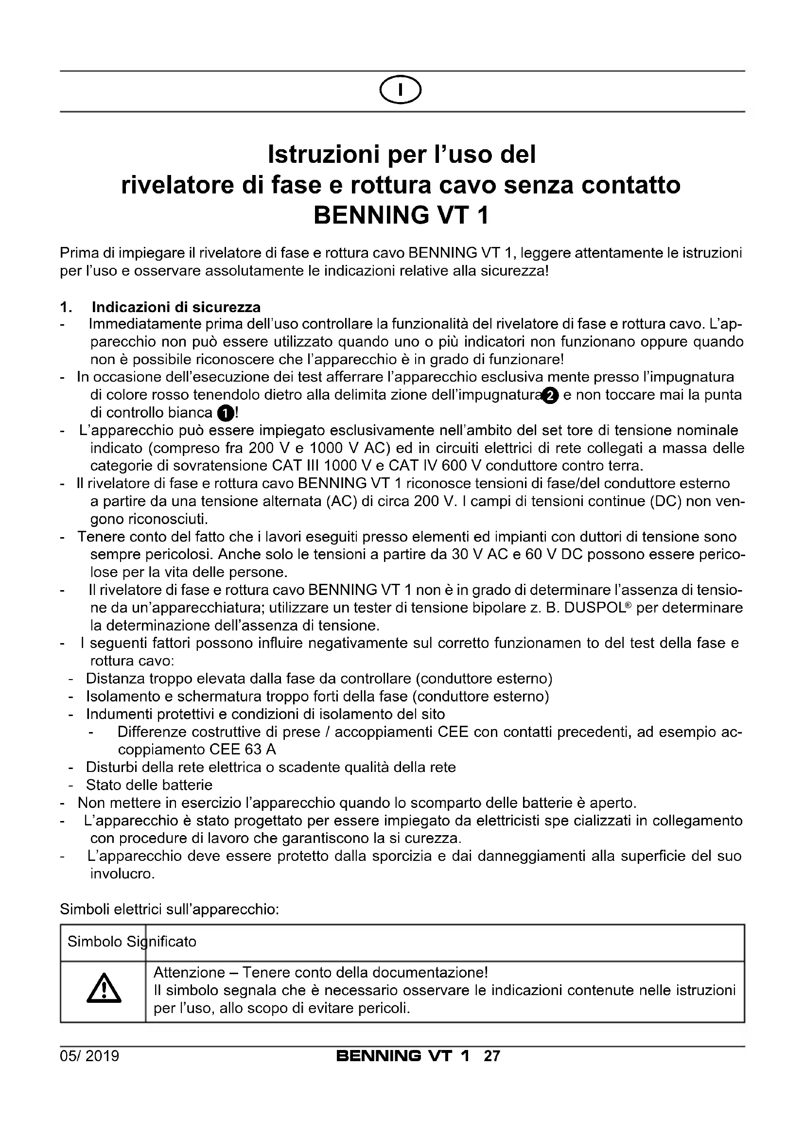 Attenzione – Tenere conto della documentazione! Il simbolo segnala che è necessario osservare le indicazioni contenute nelle istruzioni per l’uso, allo scopo di evitare pericoli.05/ 2019 BENNING VT 1