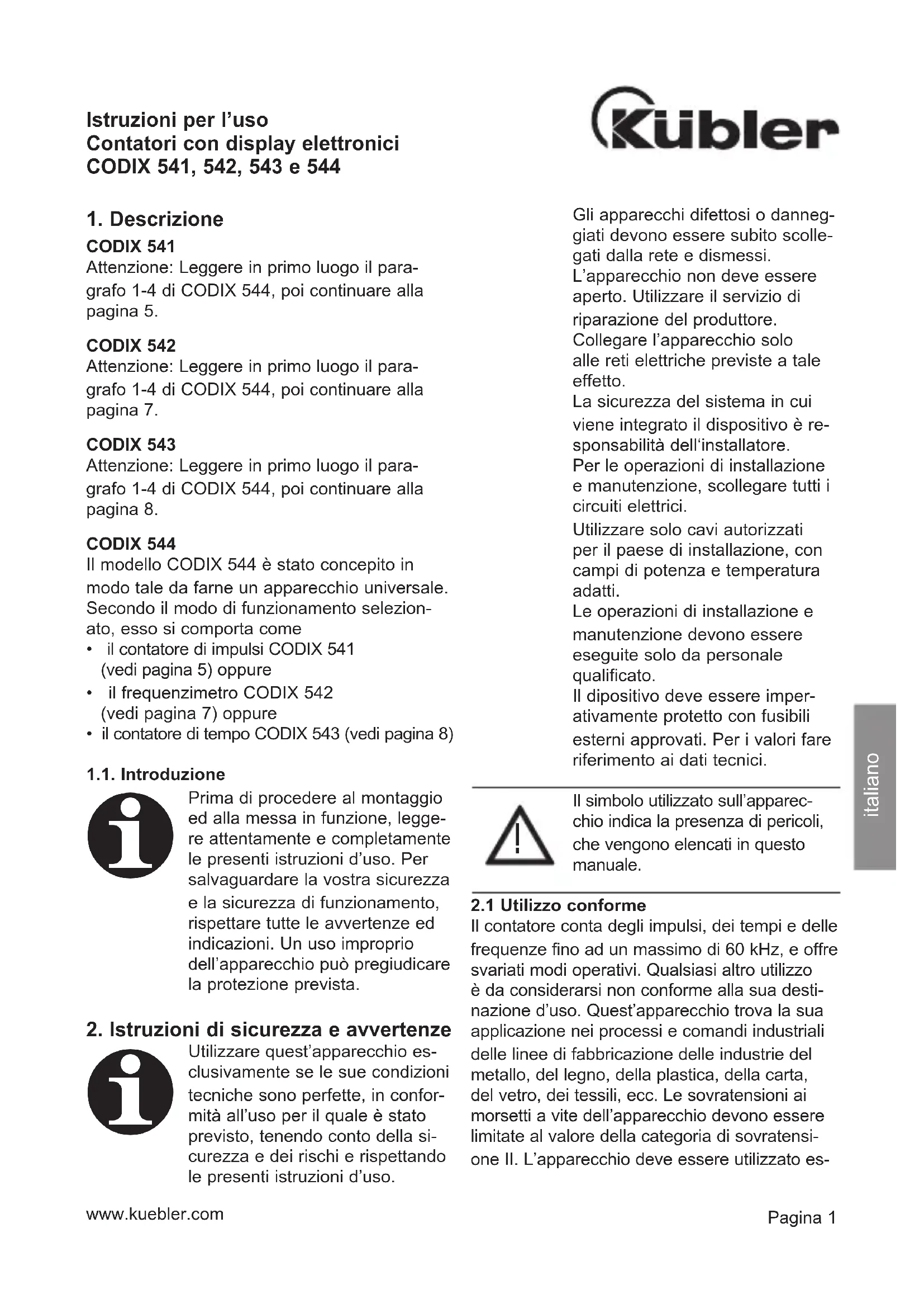 Pin Version AC Version DC 1 Collecteur sortie optocoupleur 2 Emetteur sortie optocoupleur 3 SET (norm. fermé pour Codix 542) 4 INP B (norm. fermé pour Codix 542) 5 INP A 6 GND norm. fermé 7 +24 Vout norm. fermé Pin Version AC Version DC 1 100…240 VAC ±10% 0 V DC (GND) 2 100…240 VAC ±10% 10…30 V DCPagina 1 www.kuebler.com Gli apparecchi difettosi o danneg- giati devono essere subito scolle- gati dalla rete e dismessi. L’apparecchio non deve essere aperto. Utilizzare il servizio di riparazione del produttore. Collegare l’apparecchio solo alle reti elettriche previste a tale effetto. La sicurezza del sistema in cui viene integrato il dispositivo è re- sponsabilità dell‘installatore. Per le operazioni di installazione e manutenzione, scollegare tutti i circuiti elettrici. Utilizzare solo cavi autorizzati per il paese di installazione, con campi di potenza e temperatura adatti. Le operazioni di installazione e manutenzione devono essere eseguite solo da personale qualificato. Il dipositivo deve essere imper- ativamente protetto con fusibili esterni approvati. Per i valori fare riferimento ai dati tecnici. Il simbolo utilizzato sull’apparec- chio indica la presenza di pericoli, che vengono elencati in questo manuale.