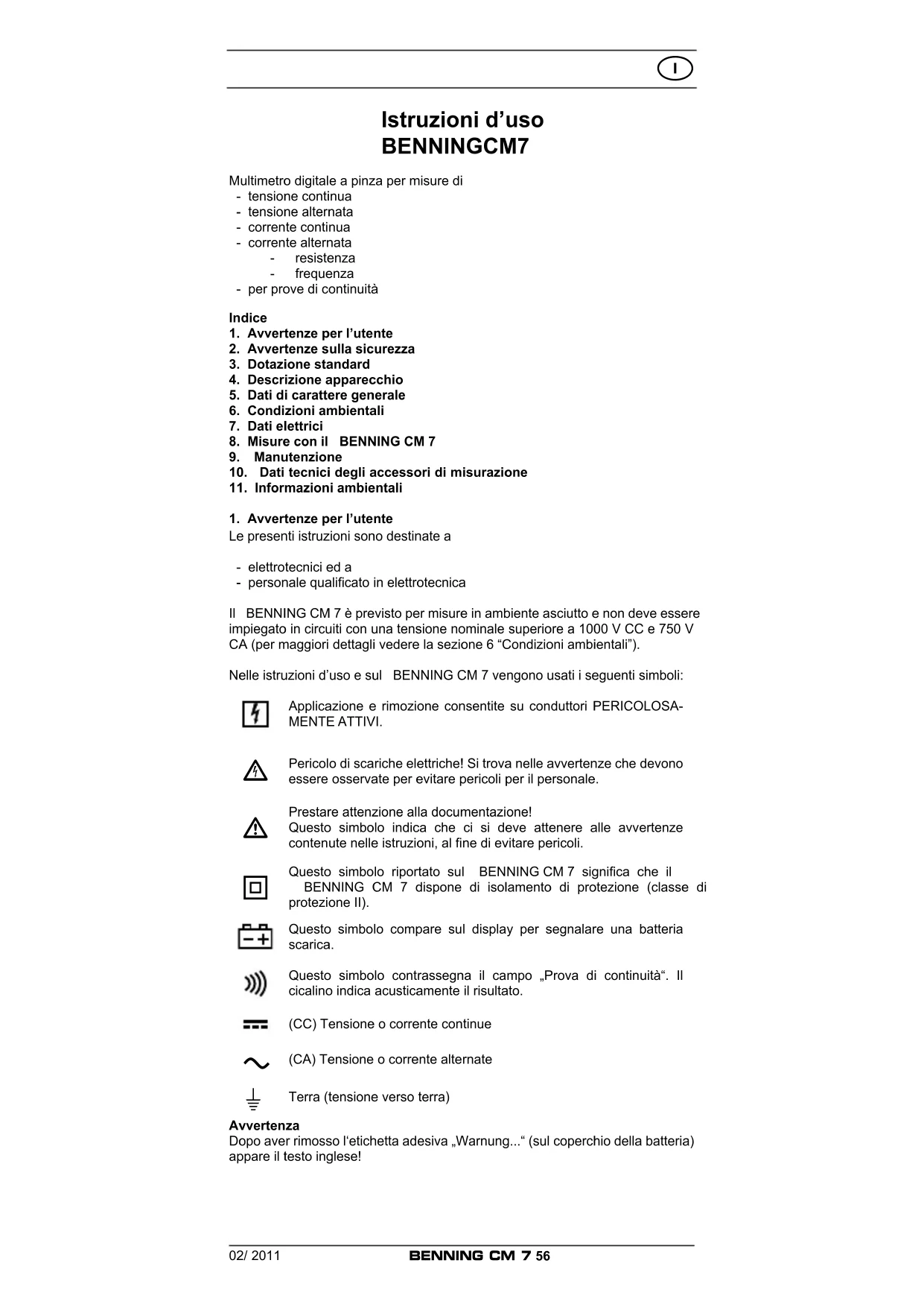Prima di aprire il BENNING CM 7 assicurarsi che esso non sia sotto tensione! Pericolo di scariche elettriche! Lavori sul BENNING CM 7 aperto e sotto tensione sono riservati esclusivamen- te ad elettrotecnici, che devono prendere particolari misure per la prevenzione di infortuni.02/ 2011