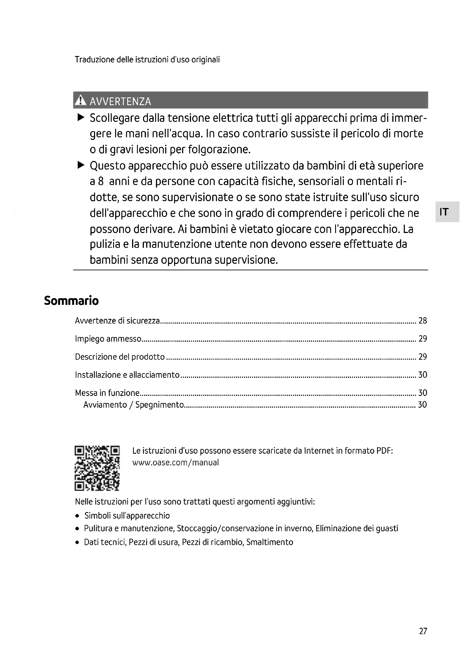 - In caso di problemi rivolgersi all’assistenza clienti autorizzata o all'azienda OASE.IT