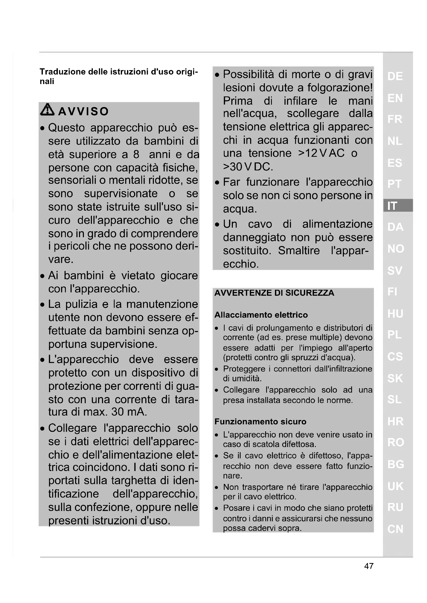 - Possibilità di morte o di gravi lesioni dovute a folgorazione! Prima di infilare le mani nell'acqua, scollegare dalla tensione elettrica gli apparec- chi in acqua funzionanti con una tensione >12 V AC o >30 V DC.