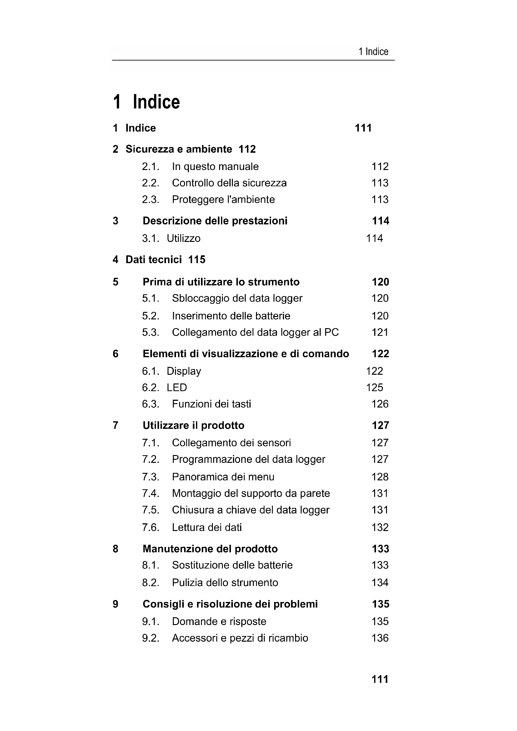 1 Indice 1 Indice 111 2 Sicurezza e ambiente 112 2.1. In questo manuale 112 2.2. Controllo della sicurezza 113 2.3. Proteggere l'ambiente 113 3 Descrizione delle prestazioni 114 3.1. Utilizzo 114 4 Dati tecnici 115 5 Prima di utilizzare lo strumento 120 5.1. Sbloccaggio del data logger 120 5.2. Inserimento delle batterie 120 5.3. Collegamento del data logger al PC 121 6 Elementi di visualizzazione e di comando 122 6.1. Display 122 6.2. LED 125 6.3. Funzioni dei tasti 126 7 Utilizzare il prodotto 127 7.1. Collegamento dei sensori 127 7.2. Programmazione del data logger 127 7.3. Panoramica dei menu 128 7.4. Montaggio del supporto da parete 131 7.5. Chiusura a chiave del data logger 131 7.6. Lettura dei dati 132 8 Manutenzione del prodotto 133 8.1. Sostituzione delle batterie 133 8.2. Pulizia dello strumento 134 9 Consigli e risoluzione dei problemi 135 9.1. Domande e risposte 135 9.2. Accessori e pezzi di ricambio 1362 Sicurezza e ambiente