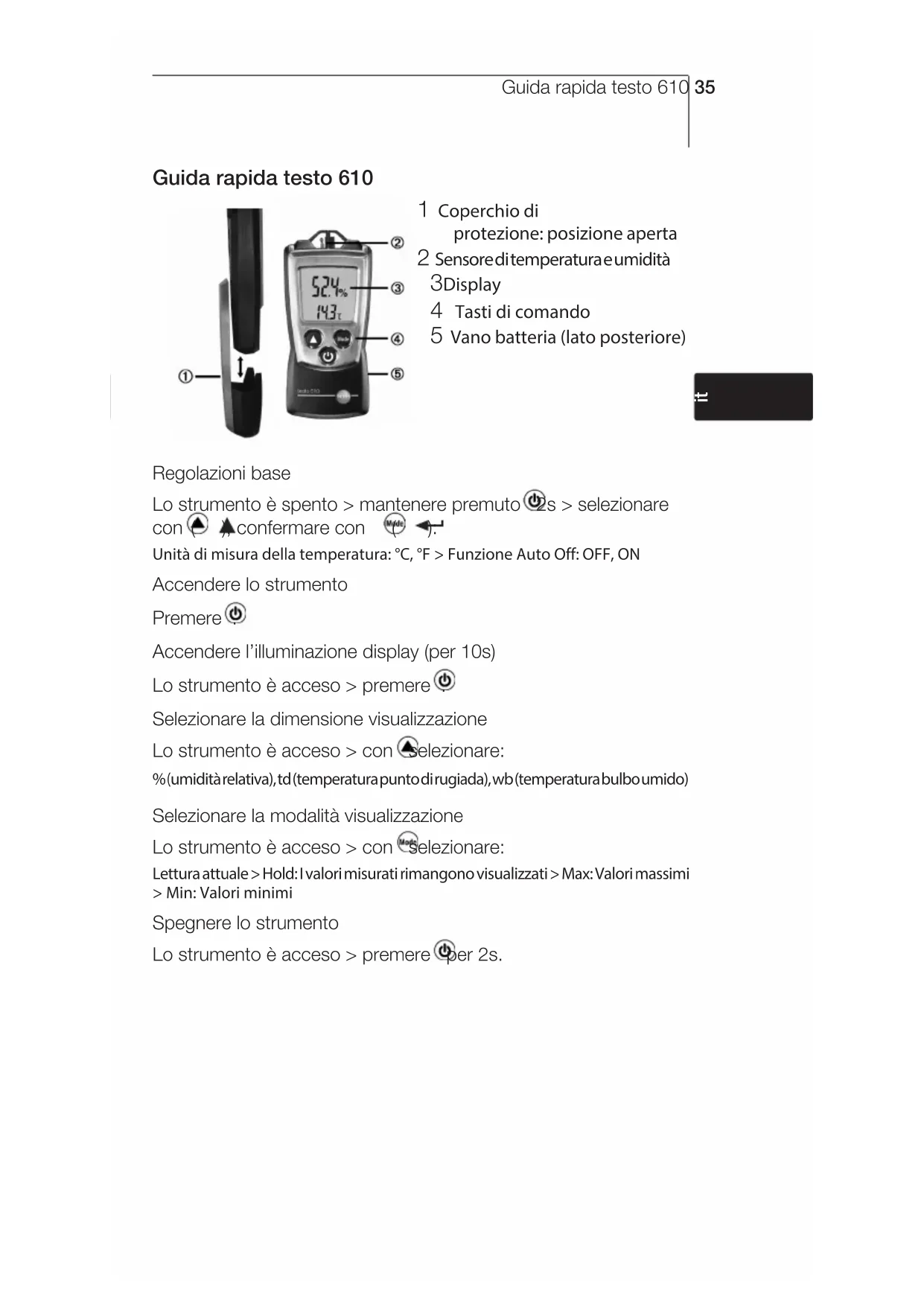??Notes34Guida rapida testo 610 35 Guida rapida testo 610 1 Coperchio di protezione: posizione aperta 2 Sensore di temperatura e umidità 3 Display 4 Tasti di comando 5 Vano batteria (lato posteriore) Regolazioni base Lo strumento è spento > mantenere premuto 2s > selezionare con ( ), confermare con ( ): Unità di misura della temperatura: °C, °F > Funzione Auto Off: OFF, ON Accendere lo strumento Premere . Accendere l’illuminazione display (per 10s) Lo strumento è acceso > premere . Selezionare la dimensione visualizzazione Lo strumento è acceso > con selezionare: % (umidità relativa), td (temperatura punto di rugiada), wb (temperatura bulbo umido) Selezionare la modalità visualizzazione Lo strumento è acceso > con selezionare: Lettura attuale > Hold: I valori misurati rimangono visualizzati > Max: Valori massimi > Min: Valori minimi Spegnere lo strumento Lo strumento è acceso > premere per 2s.