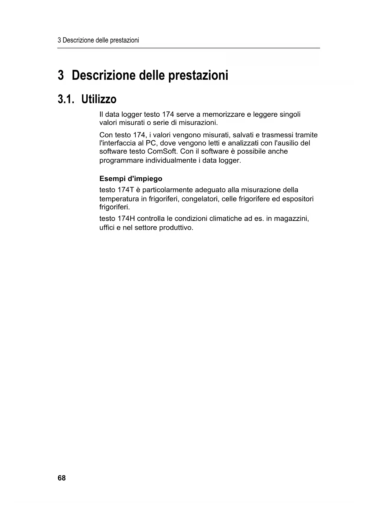 3 Descrizione delle prestazioni Pos: 13 /TD/Überschr iften/3.1 Verwendung @ 0\mod_1176211016437_ 211.doc @ 698 @ 2 @ 1 3.1. Utilizzo Pos: 14 /TD/Leistungsb eschreibung/Ver wendung/testo 174-n eu @ 5\mod_1263286512268_ 211.doc @ 54766 @ 5 @ 1 Il data logger testo 174 serve a memorizzare e leggere singoli valori misurati o serie di misurazioni. Con testo 174, i valori vengono misurati, salvati e trasmessi tramite l'interfaccia al PC, dove vengono letti e analizzati con l'ausilio del software testo ComSoft. Con il software è possibile anche programmare individualmente i data logger. Esempi d'impiego testo 174T è particolarmente adeguato alla misurazione della temperatura in frigoriferi, congelatori, celle frigorifere ed espositori frigoriferi. testo 174H controlla le condizioni climatiche ad es. in magazzini, uffici e nel settore produttivo. Pos: 15 /TD/Überschr iften/3.2 Technisc he Daten @ 0\mod_117621108843 7_211.doc @ 707 @ 2 @ 13 Descrizione delle prestazioni