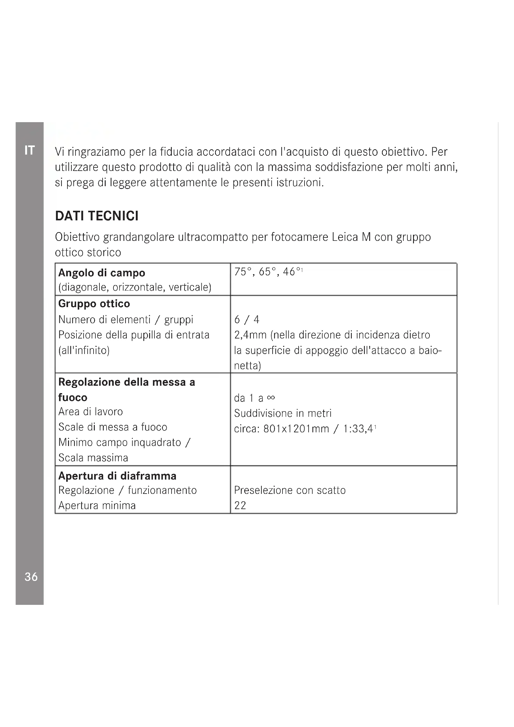 Vi ringraziamo per la fiducia accordataci con l'acquisto di questo obiettivo. Per utilizzare questo prodotto di qualità con la massima soddisfazione per molti anni, si prega di leggere attentamente le presenti istruzioni. DATI TECNICI Obiettivo grandangolare ultracompatto per fotocamere Leica M con gruppo ottico storico Angolo di campo (diagonale, orizzontale, verticale) 75°, 65°, 46°