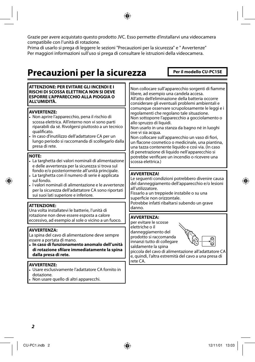 Grazie per avere acquistato questo prodotto JVC. Esso permette d’installarvi una videocamera compatibile con l’unità di rotazione. Prima di usarlo si prega di leggere le sezioni "Precauzioni per la sicurezza" e " Avvertenze" Per maggiori informazioni sull’uso si prega di consultare le istruzioni della videocamera.