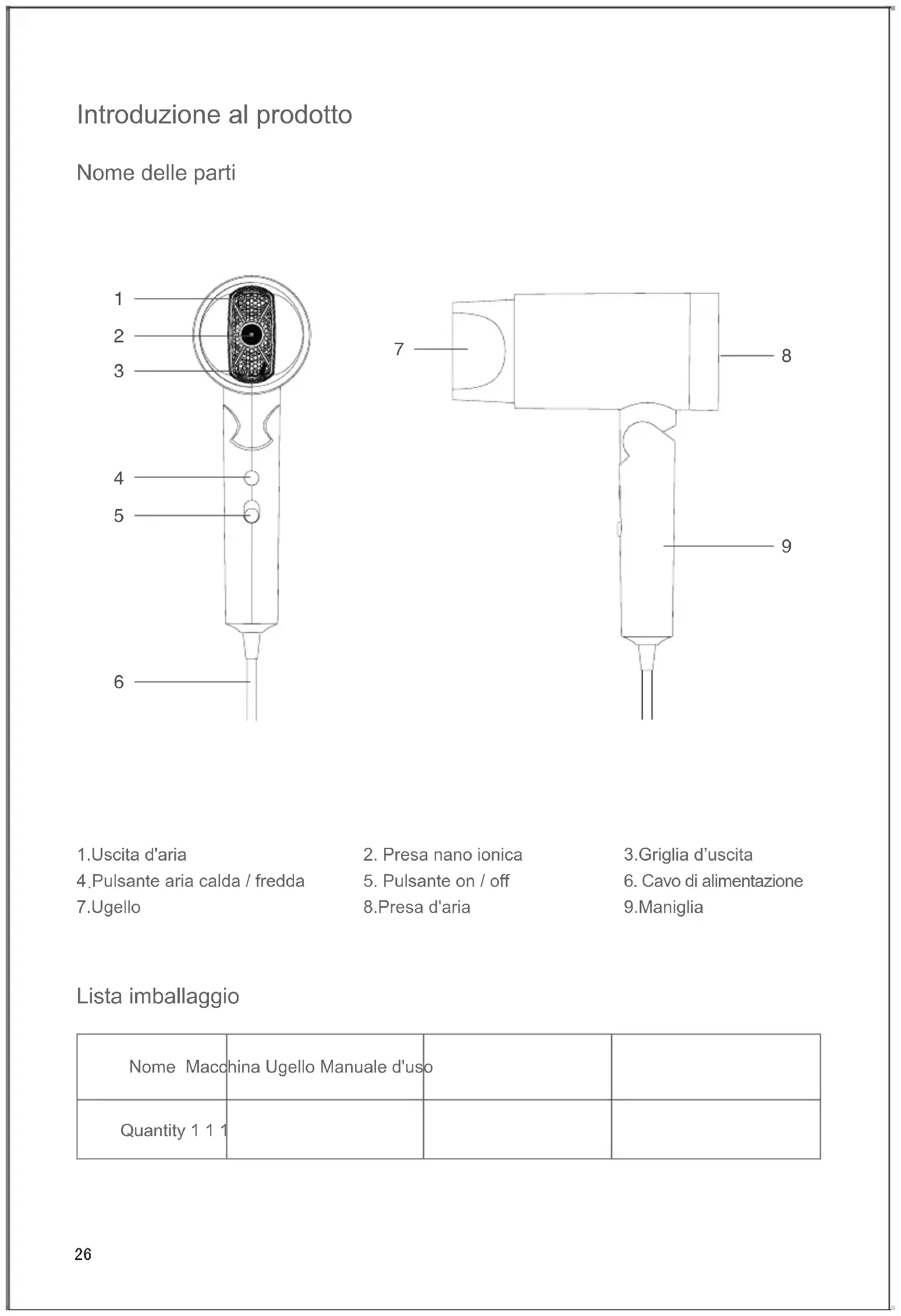 9.Maniglia Lista imballaggio Nome Macchina Ugello Manuale d'uso Quantity 1 1 1