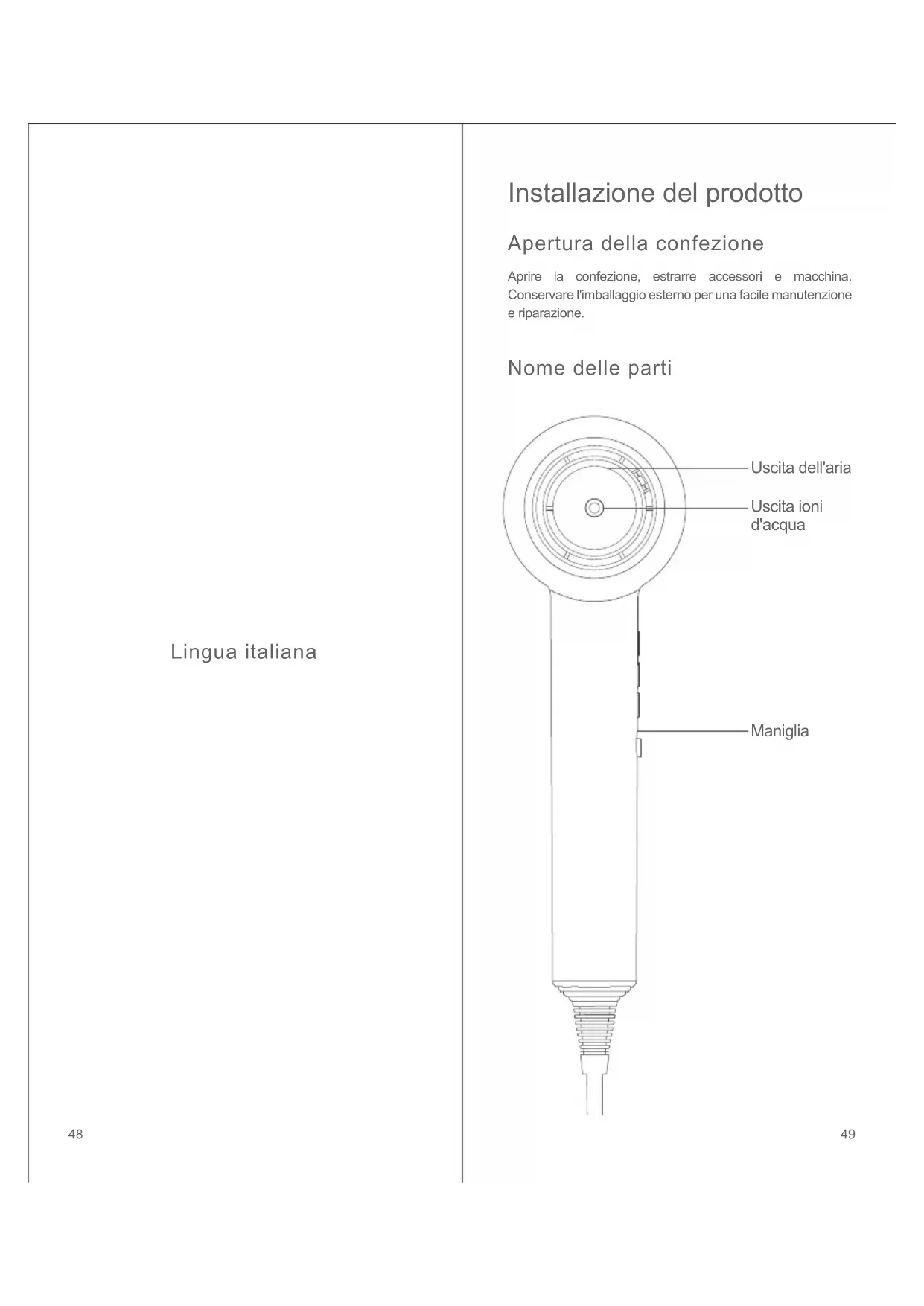 Schiebeknopf Entsorgung Kapazität Widerstand Maschinenschaltung Hoch- geschwind- igkeitsmotor 4746Lingua italiana Nome delle parti Aprire la confezione, estrarre accessori e macchina. Conservare l'imballaggio esterno per una facile manutenzione e riparazione. Installazione del prodotto Apertura della confezione Uscita dell'aria Uscita ioni d'acqua Maniglia 4948Ingresso Velocità Tasto temperatura Pulsante di accensione/spegnimento Cavo di alimentazione