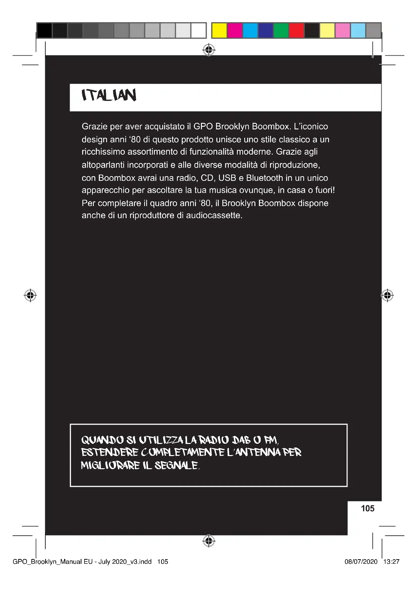 volumen del micrófono. GPO_Brooklyn_Manual EU - July 2020_v3.indd 102GPO_Brooklyn_Manual EU - July 2020_v3.indd 102 08/07/2020 13:2708/07/2020 13:27103 Soluciän de problemas El dispositivo no se enciende. Asegúrese de que la unidad está totalmente cargada y que el indicador de carga es azul. Si no es así, cargue el dispositivo usando el cable de carga suministrado. Si la batería no se carga, póngase en contacto con GPO Retro directamente para solicitar una sustitución e instrucciones. NO abra el compartimento de la batería sin consultarlo antes. No se lee el CD. Si se produce un error de lectura del CD, quizá haya introducido el CD por el lado equivocado. Extraiga el CD y dele la vuelta de forma que el lado de la etiqueta esté orientado hacia la parte trasera de la unidad. No puedo controlar la música desde la unidad. Si está usando la función Bluetooth, la reproducción debe controlarse desde el dispositivo emparejado. La reproducción de CD y USB puede controlarse desde el panel principal encima del compartimento del casete, y la reproducción del casete con el panel de control del casete que está bajo el compartimento del casete. No puedo encontrar la unidad usando Bluetooth. Si ya ha emparejado un dispositivo con la unidad y está dentro de la distancia de conexión, la unidad puede no aparecer en búsquedas de Bluetooth futuras. Intente desemparejar cualquier otro dispositivo y vuelva a intentarlo. ¿Necesita más ayuda? Visite www.gporetro.com GPO_Brooklyn_Manual EU - July 2020_v3.indd 103GPO_Brooklyn_Manual EU - July 2020_v3.indd 103 08/07/2020 13:2708/07/2020 13:27104 GPO_Brooklyn_Manual EU - July 2020_v3.indd 104GPO_Brooklyn_Manual EU - July 2020_v3.indd 104 08/07/2020 13:2708/07/2020 13:27105105 ITALIAN Grazie per aver acquistato il GPO Brooklyn Boombox. L’iconico design anni ‘80 di questo prodotto unisce uno stile classico a un ricchissimo assortimento di funzionalità moderne. Grazie agli altoparlanti incorporati e alle diverse modalità di riproduzione, con Boombox avrai una radio, CD, USB e Bluetooth in un unico apparecchio per ascoltare la tua musica ovunque, in casa o fuori! Per completare il quadro anni ‘80, il Brooklyn Boombox dispone anche di un riproduttore di audiocassette. Quando si utilizza la radio DAB o FM, estendere completamente l'antenna per migliorare il segnale. GPO_Brooklyn_Manual EU - July 2020_v3.indd 105GPO_Brooklyn_Manual EU - July 2020_v3.indd 105 08/07/2020 13:2708/07/2020 13:27106 Iniziare con il vostro GPO Brooklyn Rimuovere il dispositivo dall’imballaggio e posizionarlo su una super- cie piana e stabile. 1 – UK & EU 2 – UK 3 – EU Localizzare i 3 pezzi di cavo che compongono il cavo di alimentazione. Se si ritiene che manchi uno di questi pezzi, si prega di ricontrollare l’imballaggio, in quanto a volte si incastrano nel polistirolo. Identicate il pezzo che si adatta alle prese di corrente della vostra località (2 o 3) e collegatelo al trasformatore (1). Confermare che la batteria è già stata installata aprendo il coperchio del vano batterie sul retro dell’unità. In caso contrario, vedere la sezi- one Installazione di una batteria nella vostra Brooklyn qui sotto. GPO_Brooklyn_Manual EU - July 2020_v3.indd 106GPO_Brooklyn_Manual EU - July 2020_v3.indd 106 08/07/2020 13:2708/07/2020 13:27107 Poiché è probabile che la batteria si sia scaricata durante il trasporto, è necessario iniziare con l’alimentazione di rete, quindi inserire l’estrem- ità CC nella parte posteriore del Brooklyn, ssare la spina nella presa di corrente e accendere alla parete. L’indicatore LED dovrebbe essere rosso, a indicare che la batteria è ora in carica: UK EU Per un uso regolare, si consiglia di caricare durante la notte in questo modo e di usare la batteria di Brooklyn durante il giorno. Si prega di notare: per caricare la batteria in modo ottimale, la radio DAB è temporaneamente disattivata mentre la batteria è carica al di sotto del 75%. Se la si utilizza durante questo periodo di tempo, si potrebbero vericare delle interferenze signicative. GPO_Brooklyn_Manual EU - July 2020_v3.indd 107GPO_Brooklyn_Manual EU - July 2020_v3.indd 107 08/07/2020 13:2708/07/2020 13:27108 Utilizzo dell'indicatore LED L’indicatore LED sul retro della vostra Brooklyn vi indicherà lo stato di carica: Nessuna luce - la vostra Brooklyn non è collegata alla rete elettrica; funziona a batteria. Vi preghiamo di notare che quando il pannello del display lampeggia, la carica della batteria è molto bassa. Rosso - la vostra Brooklyn è collegata alla rete elettri- ca; la batteria è installata e in carica. Blu con luce rossa la vostra Brooklyn è collegata alla rete lampeggiante - elettrica; non è installata alcuna batteria. Blu - la vostra Brooklyn è collegata alla rete elettrica; una batteria è installata e completamente carica. Viene tenuta a piena carica ma non può essere sovraccaricata. GPO_Brooklyn_Manual EU - July 2020_v3.indd 108GPO_Brooklyn_Manual EU - July 2020_v3.indd 108 08/07/2020 13:2708/07/2020 13:27109 Installazione di una batteria nella vostra Brooklyn Si prega di seguire la sequenza per installare una batteria nel vostro GPO Brooklyn: