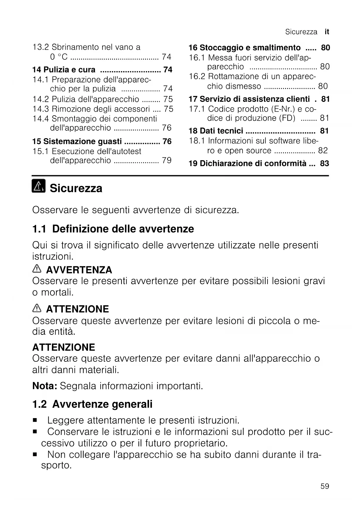 ro e open source .................... 82 19 Dichiarazione di conformità ... 83 Sicurezza 1 Sicurezza Osservare le seguenti avvertenze di sicurezza. 1.1 Definizione delle avvertenze Qui si trova il significato delle avvertenze utilizzate nelle presenti istruzioni. AVVERTENZA Osservare le presenti avvertenze per evitare possibili lesioni gravi o mortali. ATTENZIONE Osservare queste avvertenze per evitare lesioni di piccola o me- dia entità. ATTENZIONE Osservare queste avvertenze per evitare danni all'apparecchio o altri danni materiali. Nota: Segnala informazioni importanti. 1.2 Avvertenze generali ¡ Leggere attentamente le presenti istruzioni. ¡ Conservare le istruzioni e le informazioni sul prodotto per il suc- cessivo utilizzo o per il futuro proprietario. ¡ Non collegare l'apparecchio se ha subito danni durante il tra- sporto. 59it Sicurezza 1.3 Utilizzo conforme all'uso previsto Questo apparecchio è concepito esclusivamente per l'incasso. Utilizzare l'apparecchio soltanto: ¡ per refrigerare gli alimenti. ¡ in case private e in locali chiusi in ambito domestico; ¡ fino a un'altitudine di massimo 2000m sul livello del mare. 1.4 Limitazione di utilizzo Questo apparecchio può essere utilizzato da bambini di età pari o superiore a 8 anni e da persone con ridotte facoltà fisiche, senso- riali o mentali o prive di sufficiente esperienza e/o conoscenza se sorvegliati o già istruiti in merito all'utilizzo sicuro dell'apparecchio e se hanno compreso i rischi da esso derivanti. I bambini non devono giocare con l'apparecchio. Ai bambini senza sorveglianza è vietato eseguire la pulizia e ma- nutenzione di competenza dell’utente. I bambini da 3 a 8 anni possono caricare e scaricare il frigorifero/ congelatore. 1.5 Trasporto sicuro AVVERTENZA‒Pericolo di lesioni! Il peso elevato dell'apparecchio può causare lesione durante il sollevamento. Non sollevare l'apparecchio autonomamente. 1.6 Installazione sicura AVVERTENZA‒Pericolo di scosse elettriche! Le installazioni effettuate in modo non appropriato costituiscono un pericolo. Collegare e utilizzare l’apparecchio solo in conformità con i dati indicati sulla targhetta identificativa. Collegare l'apparecchio a una rete a corrente alternata soltanto con una presa con messa a terra installata a norma. Ilsistema delconduttore diprotezione dell’impianto elettrico do- mestico deve essere installato anorma. Non alimentare mai l'apparecchio da un commutatore esterno ad es. un timer esterno o un telecomando. 60Sicurezza it Se l'apparecchio è incassato, la spina di alimentazione del cavo di collegamento alla rete elettrica deve essere liberamente ac- cessibile, oppure qualora non fosse possibile accedere libera- mente alla spina, nell'impianto elettrico fisso deve essere mon- tato un dispositivo di separazione conformemente alle norme di installazione. Durante l'installazione dell'apparecchio prestare attenzione che il cavo di alimentazione non resti incastrato e non si danneggi. Un isolamento danneggiato del cavo di allacciamento alla rete co- stituisce un pericolo. Non mettere mai il cavo di allacciamento alla rete a contatto con fonti di calore. AVVERTENZA‒Pericolo di esplosione! Se le aperture di ventilazione dell'apparecchio sono chiuse, in ca- so di perdita del circuito refrigerante si può creare una miscela in- fiammabile di gas e aria. Non tappare le aperture di ventilazione all'interno dell'alloggia- mento dell'apparecchio o nell'alloggiamento a incasso. AVVERTENZA‒Pericolo di incendio! È pericoloso utilizzare un cavo di alimentazione con una prolunga e un adattatore non ammesso. Non utilizzare cavi di prolunga o prese multiple. Utilizzare esclusivamente gli adattatori e i cavi di alimentazione approvati dal produttore. Se il cavo di alimentazione è troppo corto e non è disponibile un cavo di alimentazione più lungo, contattare un elettricista per modificare l'installazione domestica. Le prese multiple mobili o gli alimentatori mobili possono surri- scaldarsi e provocare un incendio. Non collocare prese multiple mobili o alimentatori mobili nella parte posteriore dell'apparecchio. 1.7 Utilizzo sicuro AVVERTENZA‒Pericolo di scosse elettriche! L'infiltrazione di umidità può provocare una scarica elettrica. Utilizzare l'apparecchio esclusivamente in luoghi chiusi. Non esporre mai l'apparecchio a calore e umidità eccessivi. 61it Sicurezza Non lavare l'apparecchio con pulitori a vapore o idropulitrici. AVVERTENZA‒Pericolo di soffocamento! I bambini potrebbero mettersi in testa il materiale di imballaggio o avvolgersi nello stesso, rimanendo soffocati. Tenere lontano il materiale di imballaggio dai bambini. Vietare ai bambini di giocare con materiali d’imballaggio. I bambini possono inspirare o ingoiare le parti piccole, rimanendo soffocati. Tenere i bambini lontano dalle parti piccole. Non lasciare che i bambini giochino con le parti piccole. AVVERTENZA‒Pericolo di esplosione! Se il circuito refrigerante è danneggiato, può fuoriuscire del refri- gerante infiammabile ed esplodere. Per accelerare il processo di scongelamento non utilizzare di- spositivi meccanici o altri strumenti diversi da quelli consigliati dal produttore. Staccare gli alimenti congelati con un oggetto smussato, ad es. il manico di un cucchiaio di legno. I prodotti contenenti gas propellenti combustibili e sostanze esplo- sive possono esplodere, per es. bombolette spray. Non conservare nell'apparecchio prodotti contenenti gas propel- lenti combustibili e sostanze esplosive. AVVERTENZA‒Pericolo di incendio! Gli apparecchi elettrici all’interno di questo elettrodomestico pos- sono incendiarsi, ad esempio apparecchi diriscaldamento o pro- duttori di ghiaccio elettrici. Non utilizzare alcun apparecchio elettrico all'interno dell'elettro- domestico. AVVERTENZA‒Pericolo di lesioni! Icontenitori dibevande contenenti anidride carbonica possono esplodere. Non conservare nel vano a 0°C contenitori con bevande conte- nenti anidride carbonica. Per