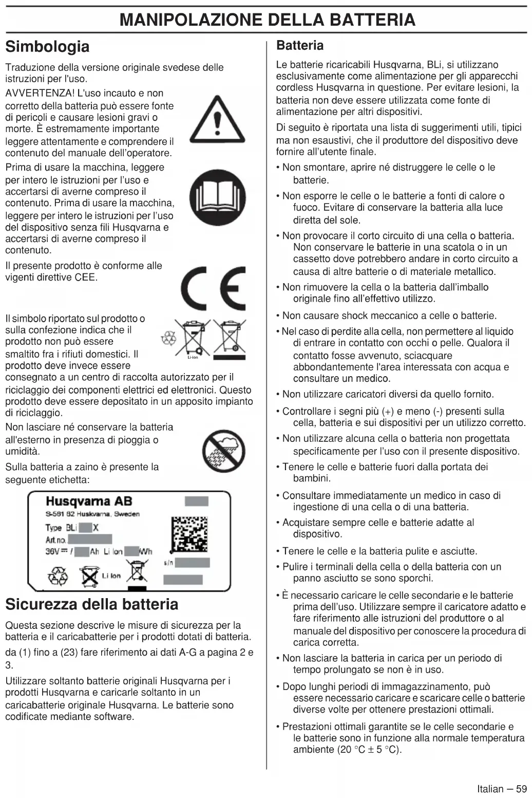 Utilizzare soltanto batterie originali Husqvarna per i prodotti Husqvarna e caricarle soltanto in un caricabatterie originale Husqvarna. Le batterie sono codificate mediante software. Batteria Le batterie ricaricabili Husqvarna, BLi, si utilizzano esclusivamente come alimentazione per gli apparecchi cordless Husqvarna in questione. Per evitare lesioni, la batteria non deve essere utilizzata come fonte di alimentazione per altri dispositivi. Di seguito è riportata una lista di suggerimenti utili, tipici ma non esaustivi, che il produttore del dispositivo deve fornire all’utente finale.