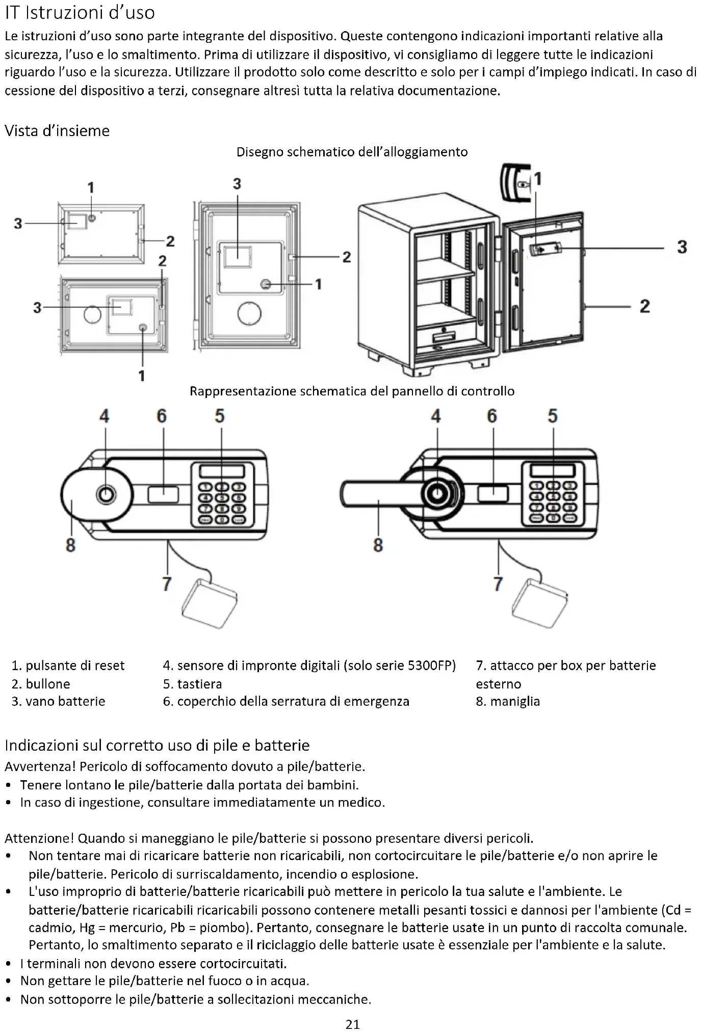 - 1 istruzioni d’uso Impostazione Aprire la cassaforte per la prima volta / Aprire la cassaforte con la chiave di emergenza: Variante 1: Apertura tramite alimentazione esterna Posizionare le batterie nel box per batterie esterno. Collegare il box per batterie esterno all’interfaccia della cassaforte (vedi "Schema del pannello di controllo"). Aprire la cassaforte con codice utente/impronta digitale (solo serie 5300FP) Variante 2: