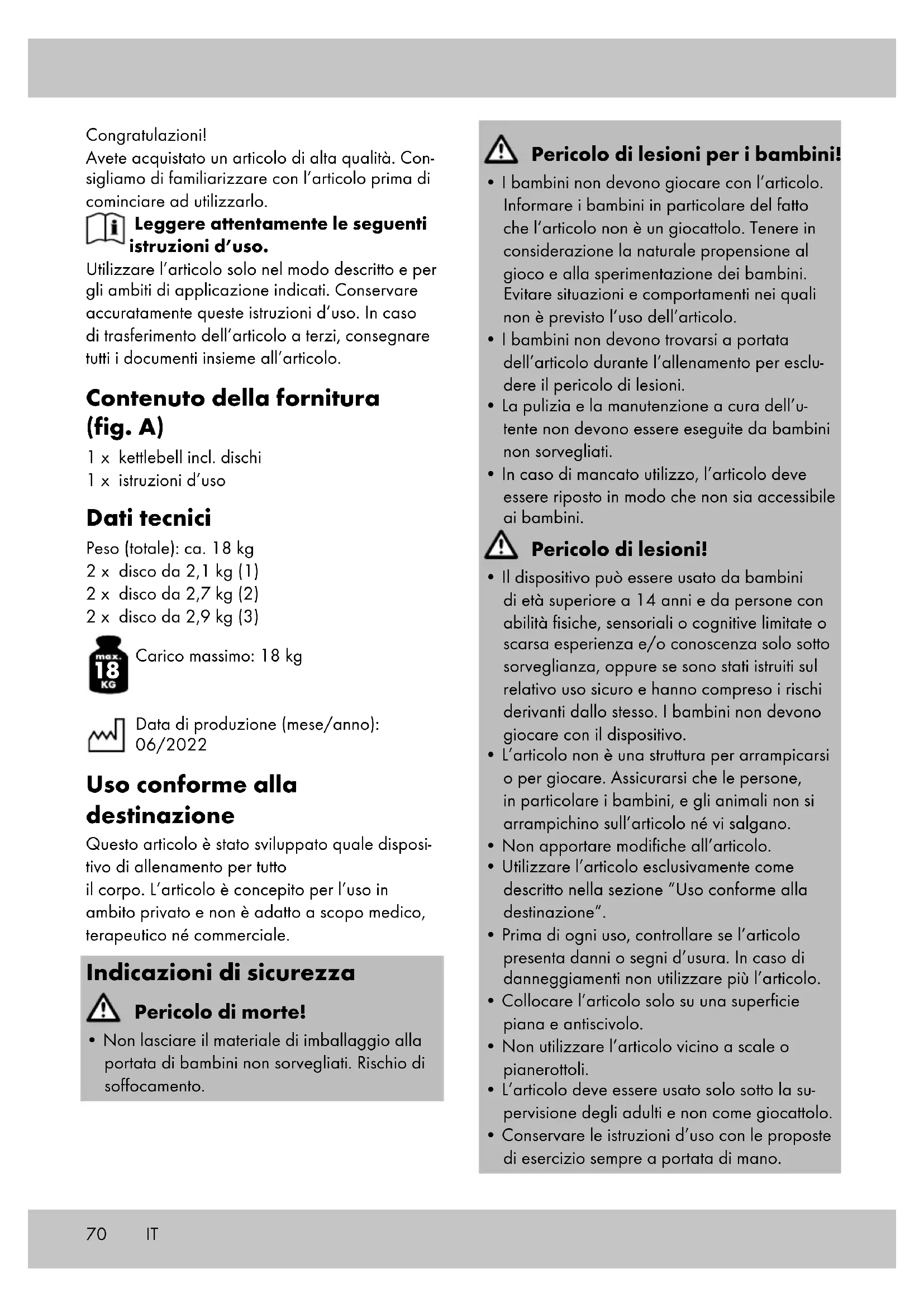 Carico massimo: 18 kg Data di produzione (mese/anno): 06/2022 Uso conforme alla destinazione Questo articolo è stato sviluppato quale disposi- tivo di allenamento per tutto il corpo. L’articolo è concepito per l’uso in ambito privato e non è adatto a scopo medico, terapeutico né commerciale. Indicazioni di sicurezza Pericolo di morte!