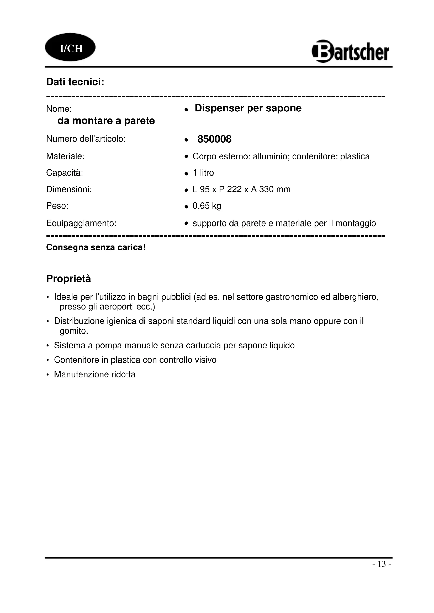 Scarica le istruzioni per il tuo Distributore di sapone in formato PDF gratuitamente! Trova il tuo manuale 850008 - BARTSCHER e riprendi in mano il tuo dispositivo elettronico. In questa pagina sono pubblicati tutti i documenti necessari per l'utilizzo del tuo dispositivo. 850008 del marchio BARTSCHER.