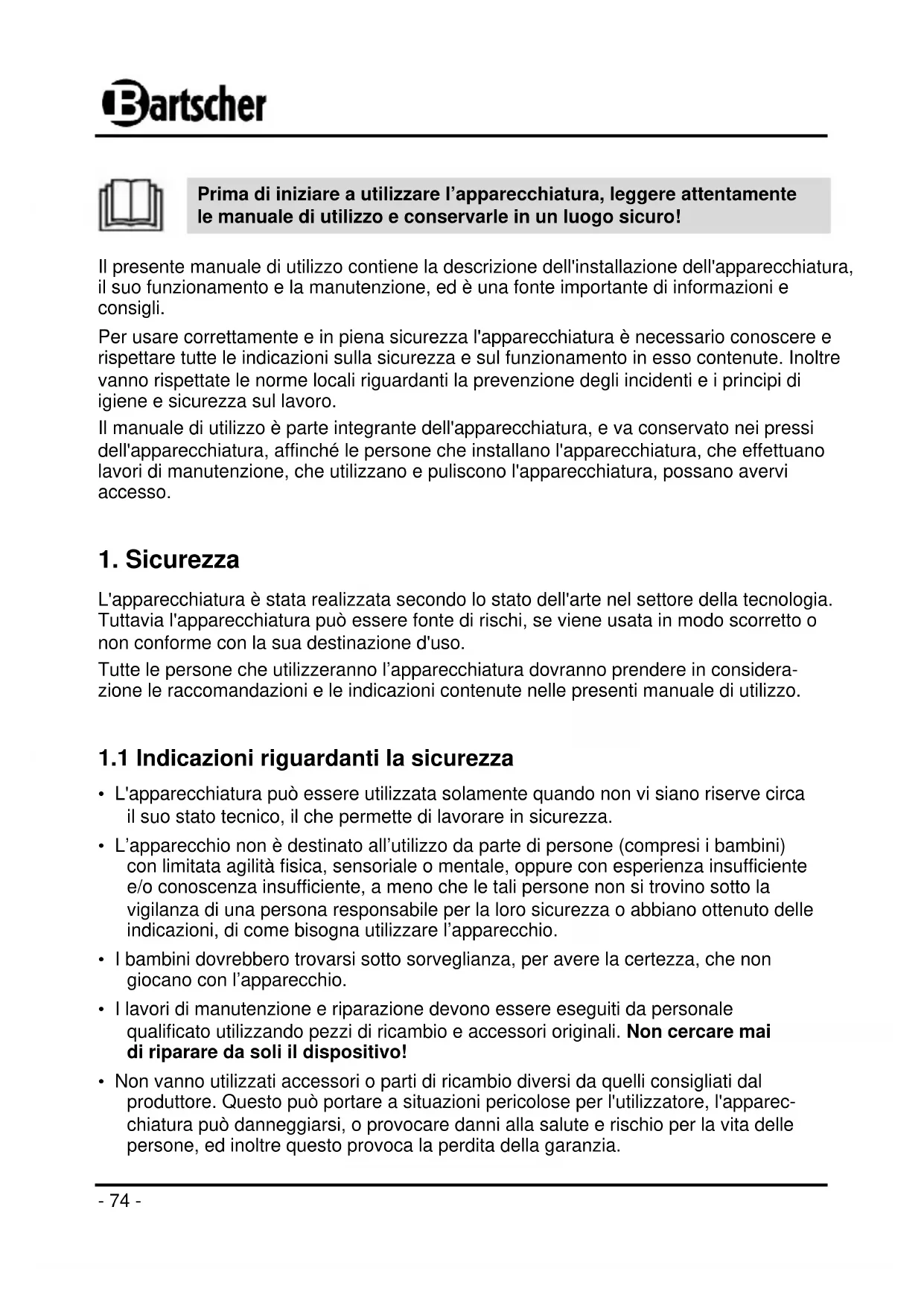 Prima di iniziare a utilizzare l’apparecchiatura, leggere attentamente le manuale di utilizzo e conservarle in un luogo sicuro! Il presente manuale di utilizzo contiene la descrizione dell'installazione dell'apparecchiatura, il suo funzionamento e la manutenzione, ed è una fonte importante di informazioni e consigli. Per usare correttamente e in piena sicurezza l'apparecchiatura è necessario conoscere e rispettare tutte le indicazioni sulla sicurezza e sul funzionamento in esso contenute. Inoltre vanno rispettate le norme locali riguardanti la prevenzione degli incidenti e i principi di igiene e sicurezza sul lavoro. Il manuale di utilizzo è parte integrante dell'apparecchiatura, e va conservato nei pressi dell'apparecchiatura, affinché le persone che installano l'apparecchiatura, che effettuano lavori di manutenzione, che utilizzano e puliscono l'apparecchiatura, possano avervi accesso.