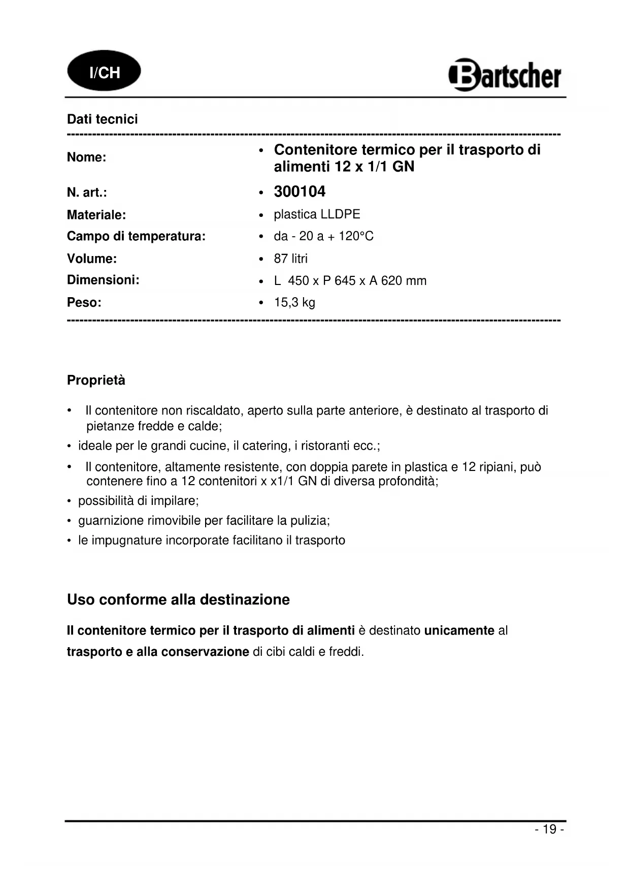Scarica le istruzioni per il tuo Contenitore per alimenti in formato PDF gratuitamente! Trova il tuo manuale 300104 - BARTSCHER e riprendi in mano il tuo dispositivo elettronico. In questa pagina sono pubblicati tutti i documenti necessari per l'utilizzo del tuo dispositivo. 300104 del marchio BARTSCHER.
