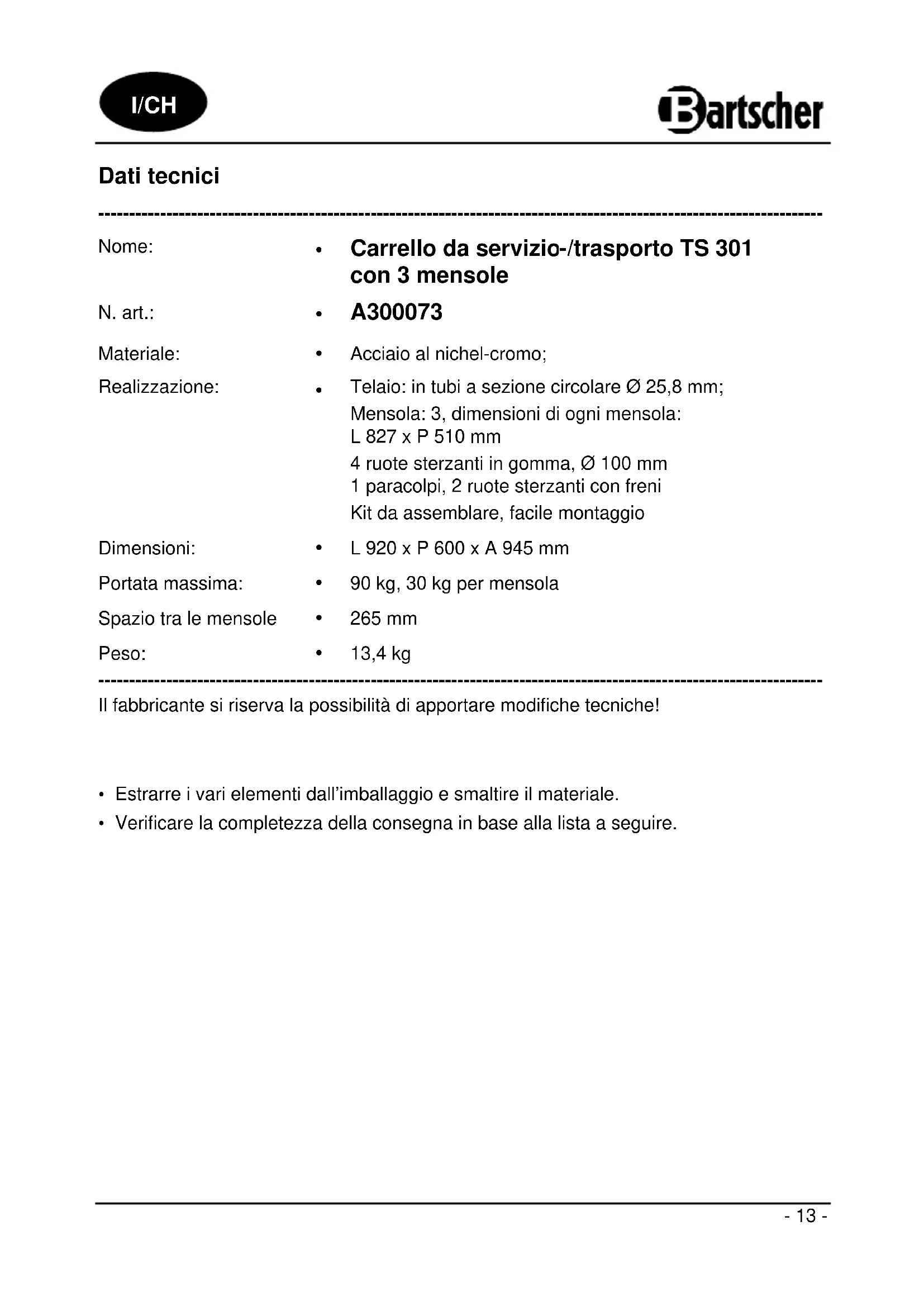 TS301 - Carrello trasporto BARTSCHER - Manuale utente e istruzioni gratuiti