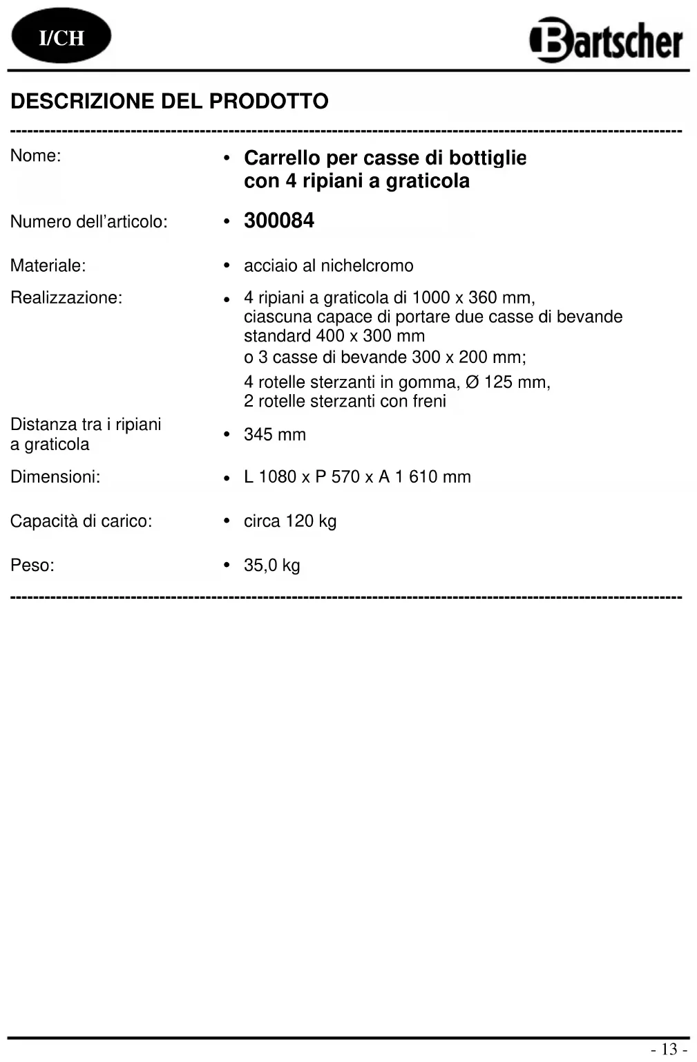 4 ripiani a graticola di 1000 x 360 mm, ciascuna capace di portare due casse di bevande standard 400 x 300 mm o 3 casse di bevande 300 x 200 mm; 4 rotelle sterzanti in gomma, Ø 125 mm, 2 rotelle sterzanti con freni
