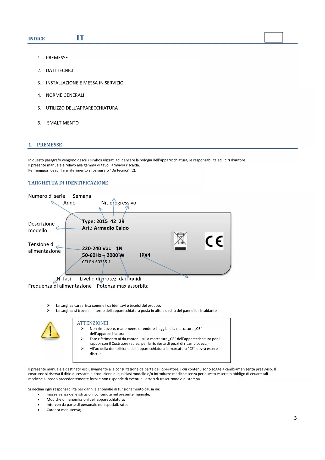 Il presente manuale è destinato esclusivamente alla consultazione da parte dell‘operatore, i cui contenuti sono soggetti a cambiamenti senza preavviso. Il costruttore si riserva il diritto di cessare la produzione di qualsiasi modello e/o introdurre modifiche senza per questo essere in obbligo di effettuare tali modifiche ai prodotti precedentemente forniti e non risponde di eventuali errori di trascrizione o di stampa. Si declina ogni responsabilità per danni e anomalie di funzionamento causati da: Inosservanza delle istruzioni contenute nel presente manuale; Modifiche o manomissioni dell‘apparecchiatura; Interventi da parte di personale non specializzato; Carenza manutentiva; Type: 2015 42 29 Art.: Armadio Caldo 220-240 Vac 1N 50-60Hz – 2000 W IPX4