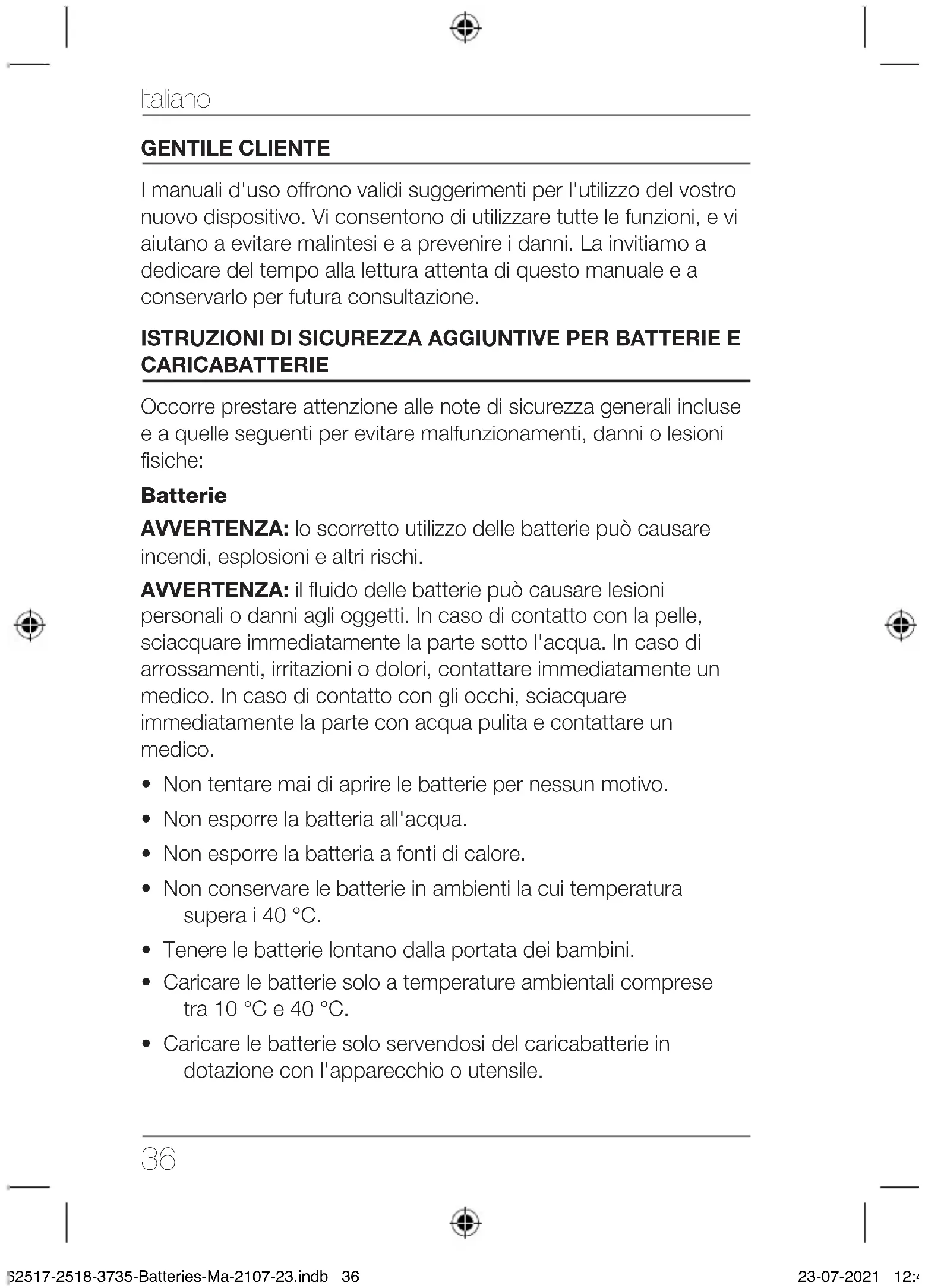 - Non tentare mai di sostituire l'unità di ricarica con una normale spina elettrica. 7062517-2518-3735-Batteries-Ma-2107-23.indb 377062517-2518-3735-Batteries-Ma-2107-23.indb 37 23-07-2021 12:4323-07-2021 12:43Italiano