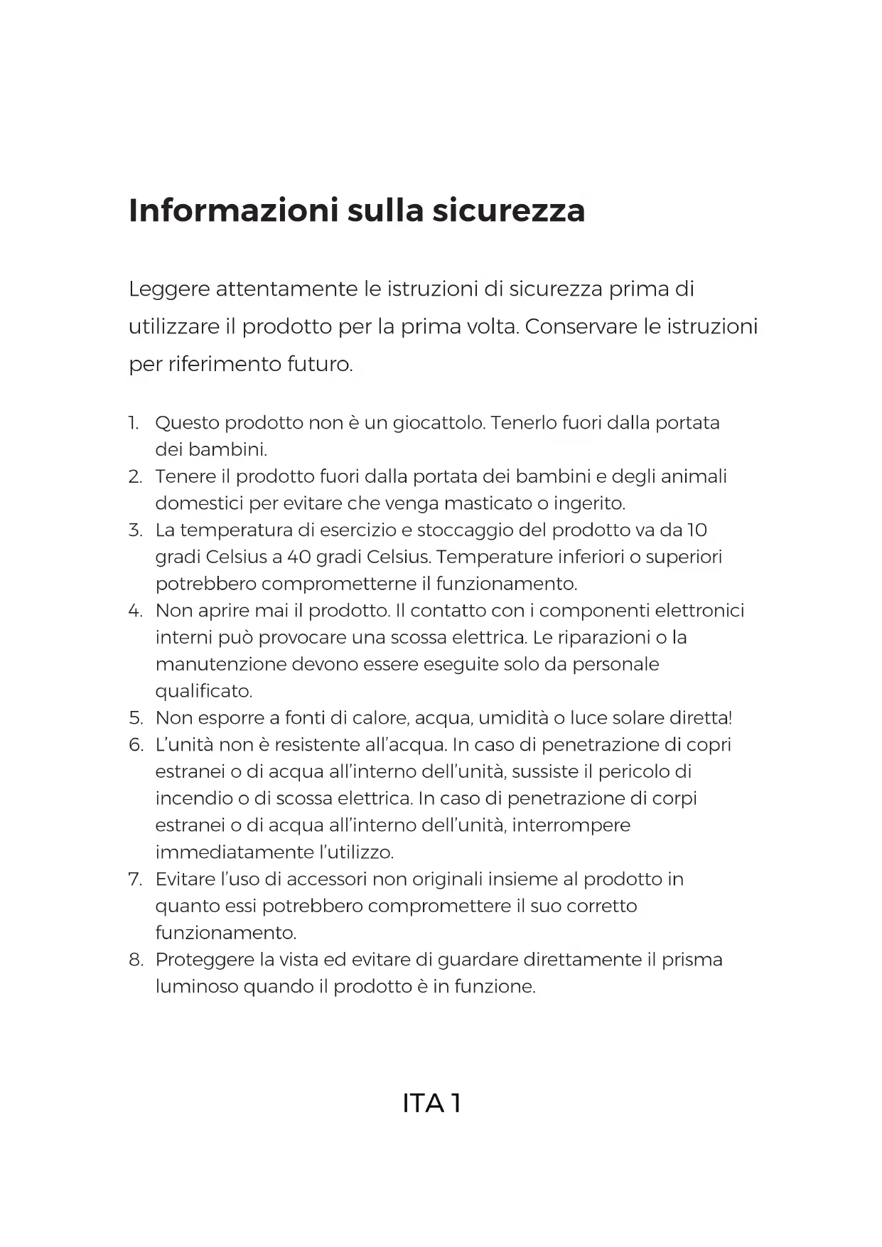ITA 1 Questo prodotto non è un giocattolo. Tenerlo fuori dalla portata dei bambini. Tenere il prodotto fuori dalla portata dei bambini e degli animali domestici per evitare che venga masticato o ingerito. La temperatura di esercizio e stoccaggio del prodotto va da 10 gradi Celsius a 40 gradi Celsius. Temperature inferiori o superiori potrebbero comprometterne il funzionamento. Non aprire mai il prodotto. Il contatto con i componenti elettronici interni può provocare una scossa elettrica. Le riparazioni o la manutenzione devono essere eseguite solo da personale qualificato. Non esporre a fonti di calore, acqua, umidità o luce solare diretta! L’unità non è resistente all’acqua. In caso di penetrazione di copri estranei o di acqua all’interno dell’unità, sussiste il pericolo di incendio o di scossa elettrica. In caso di penetrazione di corpi estranei o di acqua all’interno dell’unità, interrompere immediatamente l’utilizzo. Evitare l’uso di accessori non originali insieme al prodotto in quanto essi potrebbero compromettere il suo corretto funzionamento. Proteggere la vista ed evitare di guardare direttamente il prisma luminoso quando il prodotto è in funzione. Leggere attentamente le istruzioni di sicurezza prima di utilizzare il prodotto per la prima volta. Conservare le istruzioni per riferimento futuro.Luce da discoteca con telecomando