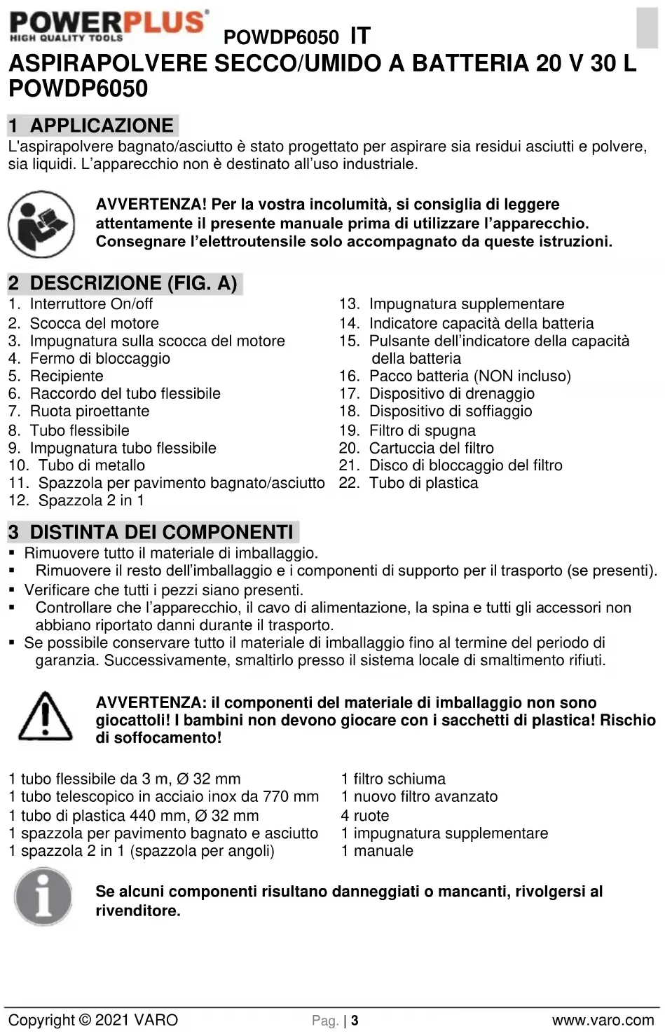 Copyright © 2021 VARO Pag. | 3 www.varo.com ASPIRAPOLVERE SECCO/UMIDO A BATTERIA 20 V 30 L POWDP6050 1 APPLICAZIONE L'aspirapolvere bagnato/asciutto è stato progettato per aspirare sia residui asciutti e polvere, sia liquidi. L’apparecchio non è destinato all’uso industriale. AVVERTENZA! Per la vostra incolumità, si consiglia di leggere attentamente il presente manuale prima di utilizzare l’apparecchio. Consegnare l’elettroutensile solo accompagnato da queste istruzioni. 2 DESCRIZIONE (FIG. A)