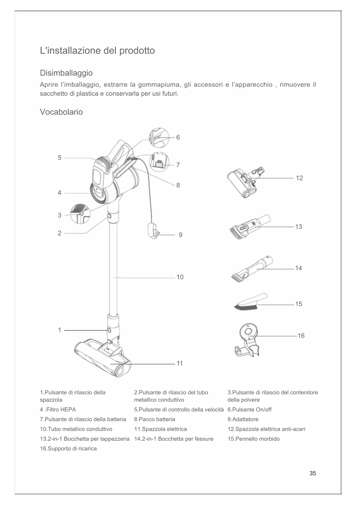 100-240V ~45 Disposizione La macchina, gli accessori e la confezione devono essere classicati per il riciclaggio amichevole all'ambiente. Non smaltire la macchina nei riuti domestici. Solo per gli stati di EC: Secondo la direttiva europea 2012/19/EU, le macchine che non sono più utilizzabili e secondo la direttiva europea 2006/66/CE, i pacchi di batteria/le batterie difettose o utilizzate, devono essere raccolte separatamente e smaltite in modo corretto e anche amichevole all’ambiente. I pacchi di batteria/le batterie: Le batterie integrate potrebbero essere rimosse solo per lo smaltimento dal personale qualicato. Un’apertura del guscio di carcassa,la macchina può essere danneggiata o distrutta. Non smaltire i pacchi di batteria/le batterie nei riuti domestici,nel fuoco o nell’acqua.Se possibile,i pacchi di batteria/le batterie devono essere scaricati,raccolti, riciclati o smaltiti in modo amichevole all’ambiente. Si può cambiare senza preavviso. Informazioni su Garanzia Questo prodotto gode di un anno di garanzia per la macchina,mentre di 6 mesi per il servizio di batteria che inizia dalla data di acquisto. La garanzia è esclusa dall’usura normale,l’utilizzo commerciale,le modiche all’ apparecchio come acquistato,le attività di pulizia, le conseguenze di un uso improprio o danni dall'acquirente o da una terza persona, e i danni che possono essere causati dall’ ambiente esterno o causati dalle batterie. Produttore Kingclean Electric Co., Ltd Indirizzo Via Xiangyang 1, Nuovo quartiere di Suzhou, Provincia di Jiangsu 215009, Cina Informazioni sul produttore46 Instalación de productos Déballage Ouvrez l'emballage, sortez le coussin en mousse, et tous les accessoires et données, prenez l'aspirateur, enlevez le depuis la valise, enlevez le sac en plastique. Conservez-les pour le transport futur. Nom des pièces 1.Bouton de libération de la brosse électrique 4 .HEPA 7.Bouton de libération du sac de batterie 10.Tube conducteur en métal 13.Outil de rembourrage 2 en 1 16.Base de charge 2.Bouton de libération du tube en métal 5.Bouton de contrôle de la vitesse 8.Sac de batterie 11.Brosse électrique 14.Outil de crevasse 2 en 1 3.Bouton de libération de la verre à poussière 6.Bouton de marche / arrêt 9.Adaptateur 12.Brosse électrique de acariens 15.Brosse douce