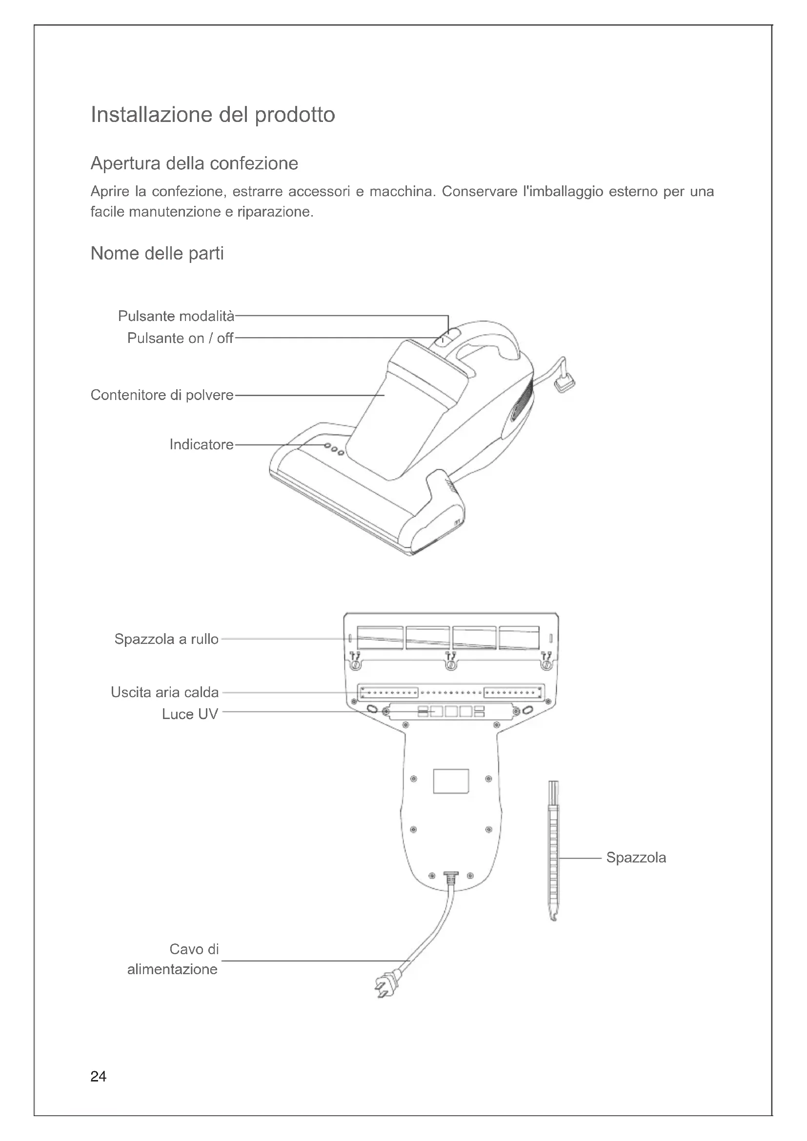 lasciarlo alla luce diretta del sole o in ambienti umidi. Precauzioni Leggere attentamente questo manuale di istruzioni prima dell'uso e conservarlo correttamente per usi futuri. Questo prodotto è un apparecchio elettrico, non lasciare mai la macchina in funzione senza supervisione. Spegnere l'interruttore di alimentazione e scollegare il cavo di alimentazione se la macchina deve essere inattiva. Non scollegare il cavo di alimentazione con mani umide in caso di scosse elettriche. Tagliare la fonte di alimentazione in manutenzione o fuori servizio. Tenere il cavo di alimentazione lontano da oggetti appuntiti e non trascinarlo per spostare la28 macchina in caso di danni al cavo. Per motivi di sicurezza, non utilizzare il prodotto per pulire oggetti caldi come carbone, mozziconi di sigarette, oggetti appuntiti come vetri rotti, liquidi corrosivi, materiali inammabili ed esplosivi come benzina e alcol. Altrimenti, potrebbe danneggiare l'intera macchina o provocare un incendio, che potrebbe causare incidenti come lesioni personali. Non utilizzare questo prodotto per pulire acqua o polvere bagnata. Non utilizzarlo in luoghi umidi (come bagno, toilette, lavanderia, ecc.) per evitare malfunzionamenti. Non posizionare la macchina in prossimità di apparecchi di riscaldamento o esporla alla luce solare diretta in caso di pericolo di incendio. Tenere questo prodotto fuori dalla portata di persone speciali come i bambini senza la supervisione di un adulto. Non utilizzare la macchina con la bocca di aspirazione bloccata in caso di danni al prodotto. Il prodotto è dotato di luce UV, per motivi di sicurezza, non guardare il fondo della macchina quando è accesa in caso di danni ai raggi ultravioletti. Si prega di non lasciare che i raggi ultravioletti irradino le piante, in modo da non danneggiare le piante. Si prega di non utilizzare i raggi ultravioletti in un punto in modo continuo, in quanto ciò potrebbe causare danni all'oggetto di pulizia. NON sedersi su questo prodotto in caso di lesioni personali e danni al prodotto. Non rimuovere la copertina per spazzola a rullo né forzare la copertina verso l'esterno quando la macchina è accesa per motivi di sicurezza. Questo prodotto può essere utilizzato SOLO per la pulizia di tessuti come materassi, coperte, cuscini, divani, ecc. Se il cavo di alimentazione è danneggiato, chiedere aiuto professionale al produttore e ad altri professionisti per motivi di sicurezza. Risoluzione dei problemi Se l'errore persiste dopo aver adottato le seguenti soluzioni, contattare immediatamente l'assistenza post-vendita o il distributore locale. Problemi Possibili ragioni Soluzione Mancanza di cor- rente Il cavo di alimentazione non è inserito saldamente. Inserire saldamente il cavo di alimentazione. Nessuna alimentazione alla presa elettrica. Controllare la presa Interruttore di alimentazione non premuto. Premere il pulsante di On / Off.29 Problemi Possibili ragioni Soluzione Bassa potenza di aspirazione Porta di aspirazione intasata. Pulire la porta di aspirazione. Accumulo di polvere sul ltro. Pulire il contenitore di polvere ed il ltro. Accumulo di polvere sul ciclone Pulire il ciclone. Accumulo di polvere sul ltro. Pulire il ltro. La luce UV non funziona La supercie dell'oggetto da pulire ha uno scarso riesso o è troppo lontana dall'oggetto da pulire. In circostanze normali, la macchi- na accende automaticamente la luce ultravioletta quando si trova a circa 5 cm dall'oggetto da pulire. La macchina si è fermata su una coperta. Si prega di spostarsi avanti e indi- etro sulla coperta. La macchina è posizionata in po- sizione verticale. Macchina inclinata non più di 30 gradi. Il foglio trasparente sulla son- da a infrarossi sul fondo della macchina è bloccato da sporco o polvere eccessiva. Pulire il foglio trasparente sulla sonda con un panno mezzo asciut- to. Danni alla luce UV. Contattare l'assistenza post-vendi- ta per sostituire la luce UV. La macchina ha smesso improv- visamente di funzionare Coperchio del contenitore di pol- vere pieno Al ne di evitare il surriscaldamen- to del motore di questo prodotto, è stato aggiunto un meccanismo di sicurezza per evitare il surriscal- damento. In tal caso, interrompere l’utilizzo, eliminare il blocco e sospenderlo per due ore prima dell’uso. Porta di aspirazione intasata. Filtro bloccato. Spazzola a rullo a smesso di fun- zionare all’im- provviso Materiale estraneo impigliato nella spazzola a rullo. Rimuovere il coperchio e ripulire la spazzola a rullo secondo la guida dell'utente. La cintura è staccata o rotta. Aprire il coperchio della spazzola a rullo secondo le istruzioni per l'uso, verificare se la cintura è staccata o rotta e sostituire la cintura nel punto designato.30