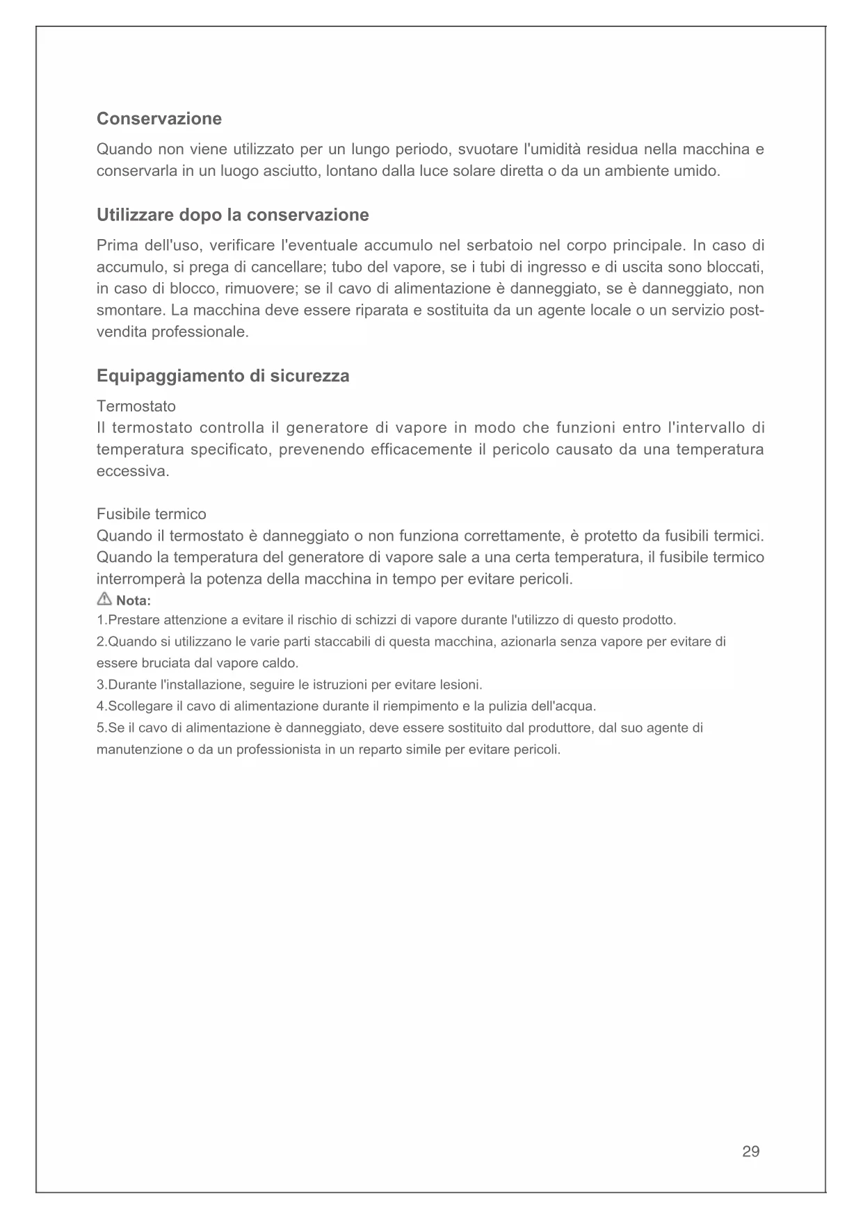 Schalter Heizung Temperatursicheru Temperaturregler29 Conservazione Quando non viene utilizzato per un lungo periodo, svuotare l'umidità residua nella macchina e conservarla in un luogo asciutto, lontano dalla luce solare diretta o da un ambiente umido. Utilizzare dopo la conservazione Prima dell'uso, verificare l'eventuale accumulo nel serbatoio nel corpo principale. In caso di accumulo, si prega di cancellare; tubo del vapore, se i tubi di ingresso e di uscita sono bloccati, in caso di blocco, rimuovere; se il cavo di alimentazione è danneggiato, se è danneggiato, non smontare. La macchina deve essere riparata e sostituita da un agente locale o un servizio post- vendita professionale. Equipaggiamento di sicurezza Termostato Il termostato controlla il generatore di vapore in modo che funzioni entro l'intervallo di temperatura specificato, prevenendo efficacemente il pericolo causato da una temperatura eccessiva. Fusibile termico Quando il termostato è danneggiato o non funziona correttamente, è protetto da fusibili termici. Quando la temperatura del generatore di vapore sale a una certa temperatura, il fusibile termico interromperà la potenza della macchina in tempo per evitare pericoli. Nota: 1.Prestare attenzione a evitare il rischio di schizzi di vapore durante l'utilizzo di questo prodotto. 2.Quando si utilizzano le varie parti staccabili di questa macchina, azionarla senza vapore per evitare di essere bruciata dal vapore caldo. 3.Durante l'installazione, seguire le istruzioni per evitare lesioni. 4.Scollegare il cavo di alimentazione durante il riempimento e la pulizia dell'acqua. 5.Se il cavo di alimentazione è danneggiato, deve essere sostituito dal produttore, dal suo agente di manutenzione o da un professionista in un reparto simile per evitare pericoli.30 Installazione del prodotto Apertura della confezione Aprire la confezione, estrarre il cuscinetto in schiuma, rimuovere tutti gli accessori e i materiali incorporati, aerrare la macchina per appendere, rimuovere la macchina per appendere dalla scatola e rimuovere il sacchetto di plastica. Conservare tutti gli accessori, i materiali e le scatole di imballaggio per il trasporto e la manutenzione futuri. Nome della parte Asse da stiro Serbatoio dell'acqua Coperchio anteriore Interruttore a pedale Maniglia di montaggio Montaggio di stendibiancheria Asta di supporto Corpo principale Base Guanti protettivi Lista imballaggio Nome della parte Corpo principale Asta di supporto Maniglia di montaggio Montaggio di stendibiancheria Quantità 1 1 1 1 Nome della parte Corpo principale Cuscinetto da stiro Guanti protettivi Manuale d'uso Quantità 1 1 1 131 Installazione a macchina Installazione dell'asta di supporto Secondo le marcature nella figura, l'asta di supporto può essere inserita direttamente durante il processo di assemblaggio (Figura 1). Quando è necessario rimuovere la asta di supporto, premere il pulsante di rilascio della asta di supporto e tirare la asta di supporto verso l'alto per rimuoverla