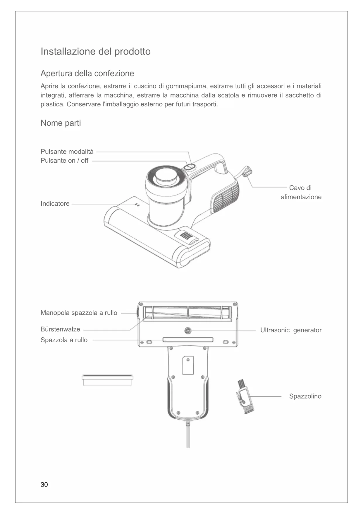 non può essere lavato. Assicurarsi che il ltro e il contenitore della polvere siano completamente asciutti prima di un altro utilizzo. Figura 5 Figura 6 Figura 7 Ciclone Filtro MIF Figura 834 Pulizia e Installazione della Spazzola a rullo Spegnere la macchina e scollegare il cavo di alimentazione, ruotare la manopola di blocco destra in senso antiorario con la mano dalla posizione di blocco alla posizione di sblocco (Figura 9) per rimuovere la spazzola per pulire (Figura 10). Dopo la pulizia della spazzola a rullo, inserire la spazzola a rullo dal foro a destra. Accertarsi che il tappo sinistro della spazzola a rullo sia completamente inserito nella cinghia (secondo la Figura 11) per bloccare la spazzola a rullo sulla nestra, altrimenti la spazzola a rullo non può essere bloccata. Avviso: per motivi di sicurezza, spegnere la macchina e scollegare il cavo di alimentazione prima di pulire la spazzola a rullo. Manutenzione e conservazione Si prega di pulire il contenitore di polvere e il ltro dopo ogni utilizzo per un ulteriore utilizzo. Se il contenitore di polvere viene riempito di polvere durante l'uso, si consiglia di pulirlo immediatamente, altrimenti inuirà sull'effetto dell'uso. Si consiglia di sostituire un ltro dopo 30-50 ore di lavoro (a seconda della situazione specica) per un migliore utilizzo. Ruotare manualmente la spazzola a rullo per facilitare l'ingresso della spazzola a rullo Figura 9 Figura 11 Figura 1035 La penetrazione dei raggi ultravioletti è debole, qualsiasi carta, vetro o plastica potrebbe ridurre notevolmente l'intensità delle radiazioni ultraviolette. Inoltre, le macchie di polvere e olio sul coperchio trasparente inferiore influenzeranno direttamente la sua capacità di penetrazione, quindi il coperchio trasparente deve essere pulito regolarmente per evitare di influenzare la penetrazione dei raggi UV e l'intensità dell'irradiazione. Non toccare la copertura trasparente con le dita, perché le macchie influenzeranno la penetrazione della luce ultravioletta. Quando non si utilizza la macchina per un lungo periodo, posizionare la macchina in un luogo fresco e asciutto e non esporla alla luce solare diretta o in un ambiente umido. Precauzioni Leggere attentamente questo manuale di istruzioni prima dell'uso e conservarlo correttamente per usi futuri. Questo prodotto è un apparecchio elettrico, non lasciare mai la macchina in funzione senza supervisione. Spegnere l'interruttore di alimentazione e scollegare il cavo di alimentazione se la macchina deve essere inattiva. Non scollegare il cavo di alimentazione con mani umide in caso di scosse elettriche. Tagliare la fonte di alimentazione in manutenzione o fuori servizio. Tenere il cavo di alimentazione lontano da oggetti appuntiti e non trascinarlo per spostare la macchina in caso di danni al cavo. Per motivi di sicurezza, non utilizzare il prodotto per pulire oggetti caldi come carbone, mozziconi di sigarette, oggetti appuntiti come vetri rotti, liquidi corrosivi, materiali inammabili ed esplosivi come benzina e alcol. Altrimenti, potrebbe danneggiare l'intera macchina o provocare un incendio, che potrebbe causare incidenti come lesioni personali. Non utilizzare questo prodotto per pulire acqua o polvere bagnata. Non utilizzarlo in luoghi umidi (come bagno, toilette, lavanderia, ecc.) per evitare malfunzionamenti. Non posizionare la macchina in prossimità di apparecchi di riscaldamento o esporla alla luce solare diretta in caso di pericolo di incendio. Tenere questo prodotto fuori dalla portata di persone speciali come i bambini senza la supervisione di un adulto. Non utilizzare la macchina con la bocca di aspirazione bloccata in caso di danni al prodotto. Il prodotto è dotato di luce UV, per motivi di sicurezza, non guardare il fondo della macchina quando è accesa in caso di danni ai raggi ultravioletti.36 Si prega di non lasciare che i raggi ultravioletti irradino le piante, in modo da non danneggiare le piante. Si prega di non utilizzare i raggi ultravioletti in un punto in modo continuo, in quanto ciò potrebbe causare danni all'oggetto di pulizia. NON sedersi su questo prodotto in caso di lesioni personali e danni al prodotto. Non rimuovere la copertina per spazzola a rullo né forzare la copertina verso l'esterno quando la macchina è accesa per motivi di sicurezza. Questo prodotto può essere utilizzato SOLO per la pulizia di tessuti come materassi, coperte, cuscini, divani, ecc. Se il cavo di alimentazione è danneggiato, chiedere aiuto professionale al produttore e ad altri professionisti per motivi di sicurezza. Risoluzione dei problemi Se l'errore persiste dopo aver adottato le seguenti soluzioni, contattare immediatamente l'assistenza post-vendita o il distributore locale. Problemi Possibili ragioni Soluzione Mancanza di cor- rente Il cavo di alimentazione non è inserito saldamente. Inserire saldamente il cavo di alimentazione. Nessuna alimentazione alla presa elettrica. Controllare la presa Interruttore di alimentazione non premuto. Premere il pulsante di On / Off. Bassa potenza di aspirazione Porta di aspirazione intasata. Pulire la porta di aspirazione. Accumulo di polvere sul ltro. Pulire il contenitore di polvere ed il ltro. Accumulo di polvere sul ciclone Pulire il ciclone. Accumulo di polvere sul ltro. Pulire il ltro. Bassa potenza di aspirazione Porta di aspirazione intasata. Pulire la porta di aspirazione. Accumulo di polvere sul ltro. Pulire il contenitore di polvere ed il ltro. Accumulo di polvere sul ciclone Pulire il ciclone. Accumulo di polvere sul ltro. Pulire il ltro.37 La luce UV non funziona La supercie dell'oggetto da pulire ha uno scarso riesso o è troppo lontana dall'oggetto da pulire. In circostanze normali, la macchi- na accende automaticamente la luce ultravioletta quando si trova a circa 5 cm dall'oggetto da pulire. La macchina si è fermata su una coperta. Si prega di spostarsi avanti e indi- etro sulla coperta. La macchina è posizionata in po- sizione verticale. Macc