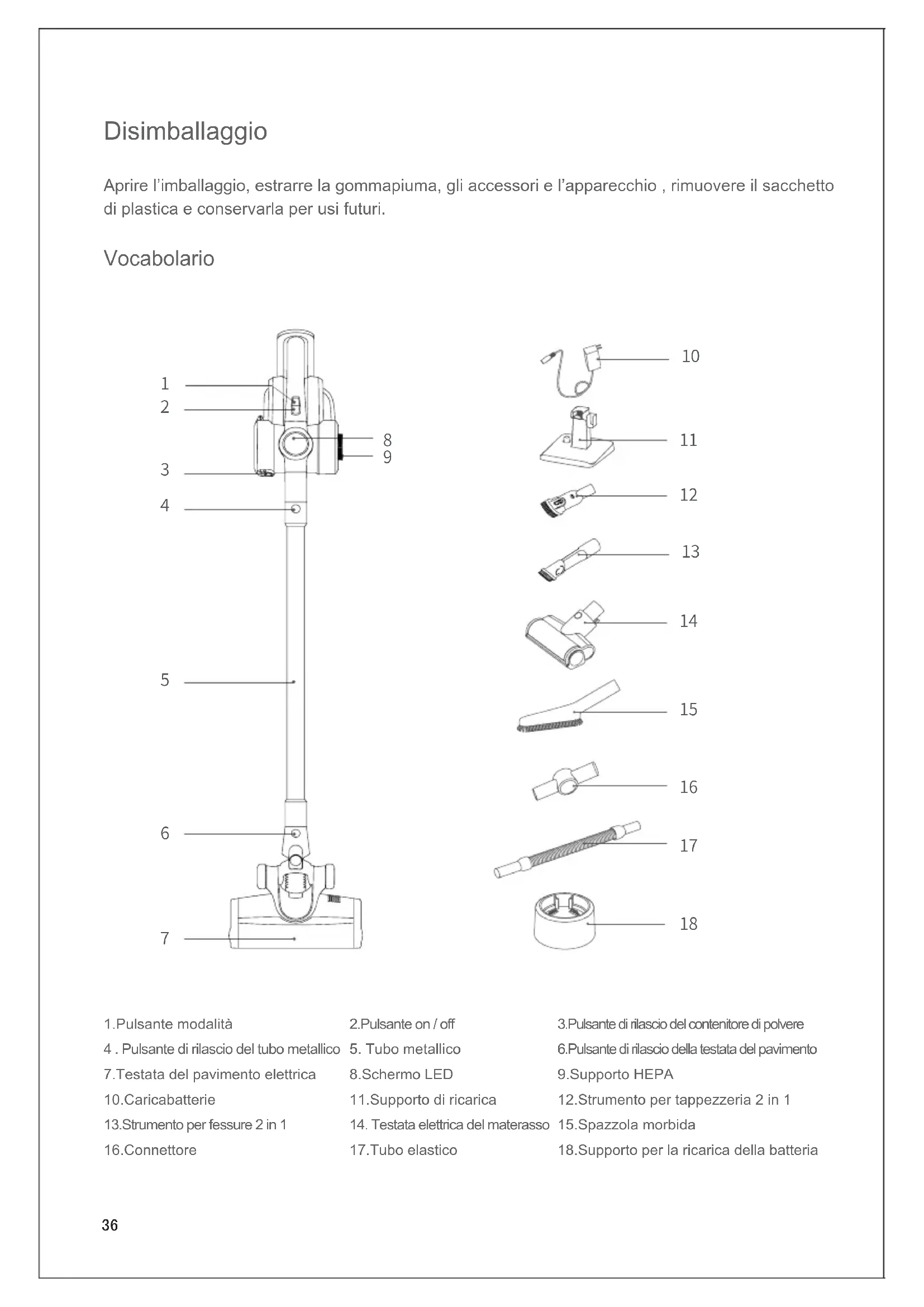 17.Tubo elastico 3.Pulsante di rilascio del contenitore di polvere 6.Pulsante di rilascio della testata del pavimento 9.Supporto HEPA 12.Strumento per tappezzeria 2 in 1 15.Spazzola morbida 18.Supporto per la ricarica della batteria