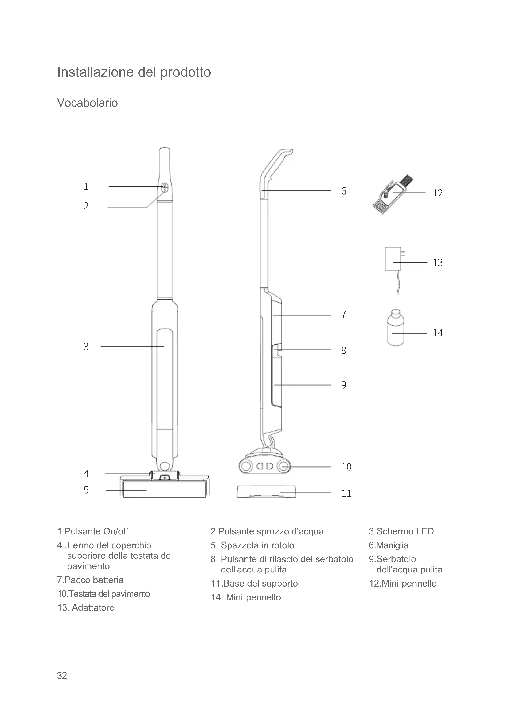 3.Schermo LED 6.Maniglia 9.Serbatoio dell'acqua pulita 12.Mini-pennello33 Packing List Nome delle parti Assemblaggio del corpo principale Maniglia di montaggio Adattatore Base del supporto Quantity 1 1 1 1 Nome delle parti Mini-pennello Istruzioni per uso Shampoo per la pulizia dei pavimenti Quantity 1 1 1 Assemblaggio della macchina Assemblaggio maniglia e corpo principale