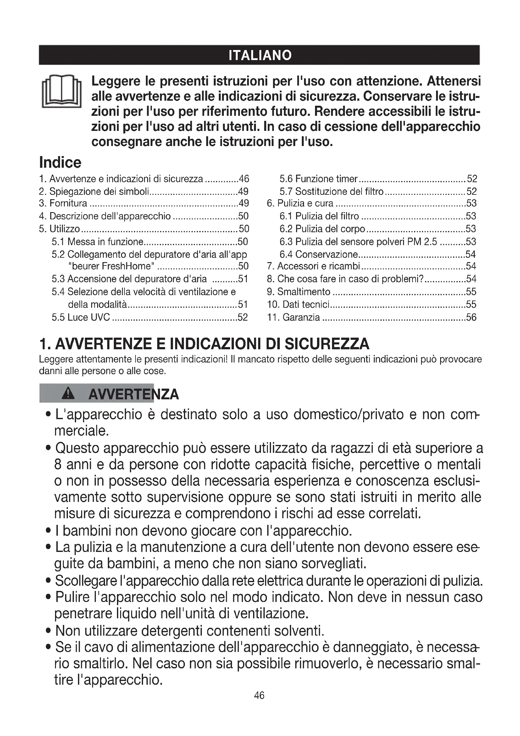 zioni per l'uso per riferimento futuro. Rendere accessibili le istru- zioni per l'uso ad altri utenti. In caso di cessione dell'apparecchio consegnare anche le istruzioni per l'uso. Indice ITALIANO