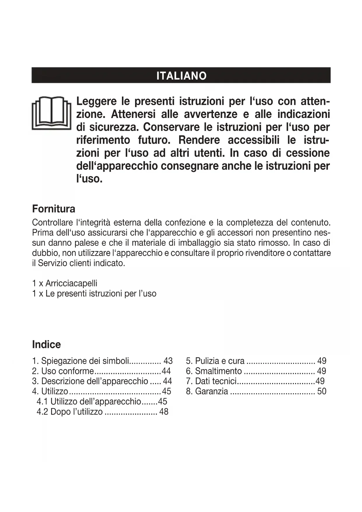 zioni per l‘uso ad altri utenti. In caso di cessione dell‘apparecchio consegnare anche le istruzioni per l‘uso. Fornitura Controllare l‘integrità esterna della confezione e la completezza del contenuto. Prima dell‘uso assicurarsi che l‘apparecchio e gli accessori non presentino nes- sun danno palese e che il materiale di imballaggio sia stato rimosso. In caso di dubbio, non utilizzare l‘apparecchio e consultare il proprio rivenditore o contattare il Servizio clienti indicato. 1 x Arricciacapelli 1 x Le presenti istruzioni per l’uso