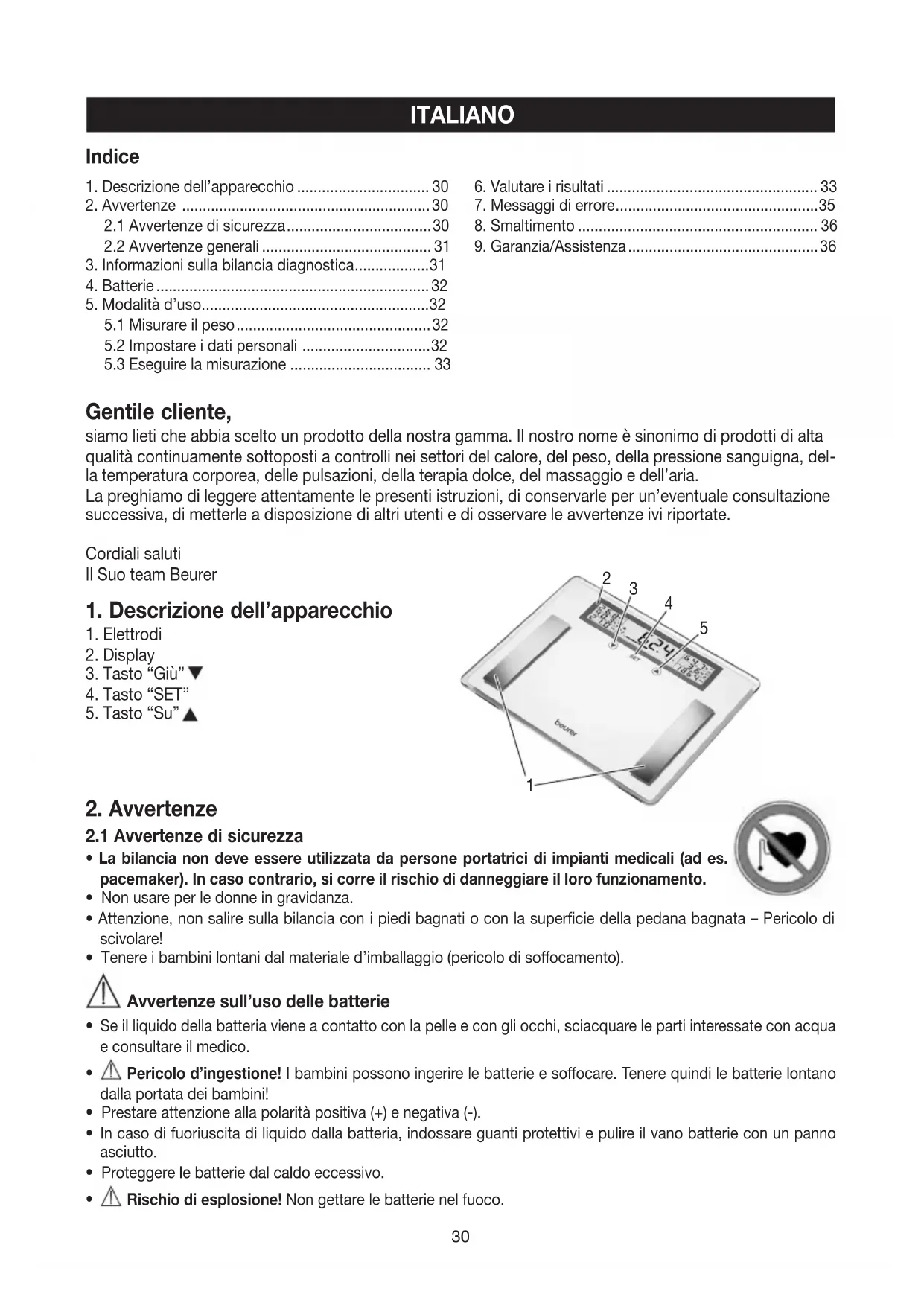 - La bilancia non deve essere utilizzata da persone portatrici di impianti medicali (ad es. pacemaker). In caso contrario, si corre il rischio di danneggiare il loro funzionamento.• Non usare per le donne in gravidanza. • Attenzione, non salire sulla bilancia con i piedi bagnati o con la superficie della pedana bagnata – Pericolo di scivolare!• Tenere i bambini lontani dal materiale d’imballaggio (pericolo di soocamento). Avvertenze sull’uso delle batterie