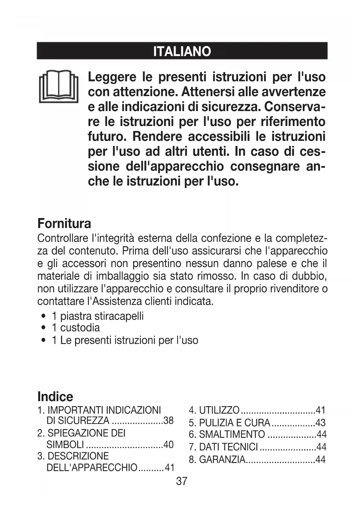 Indice Fornitura Controllare l'integrità esterna della confezione e la completez- za del contenuto. Prima dell'uso assicurarsi che l'apparecchio e gli accessori non presentino nessun danno palese e che il materiale di imballaggio sia stato rimosso. In caso di dubbio, non utilizzare l'apparecchio e consultare il proprio rivenditore o contattare l'Assistenza clienti indicata.