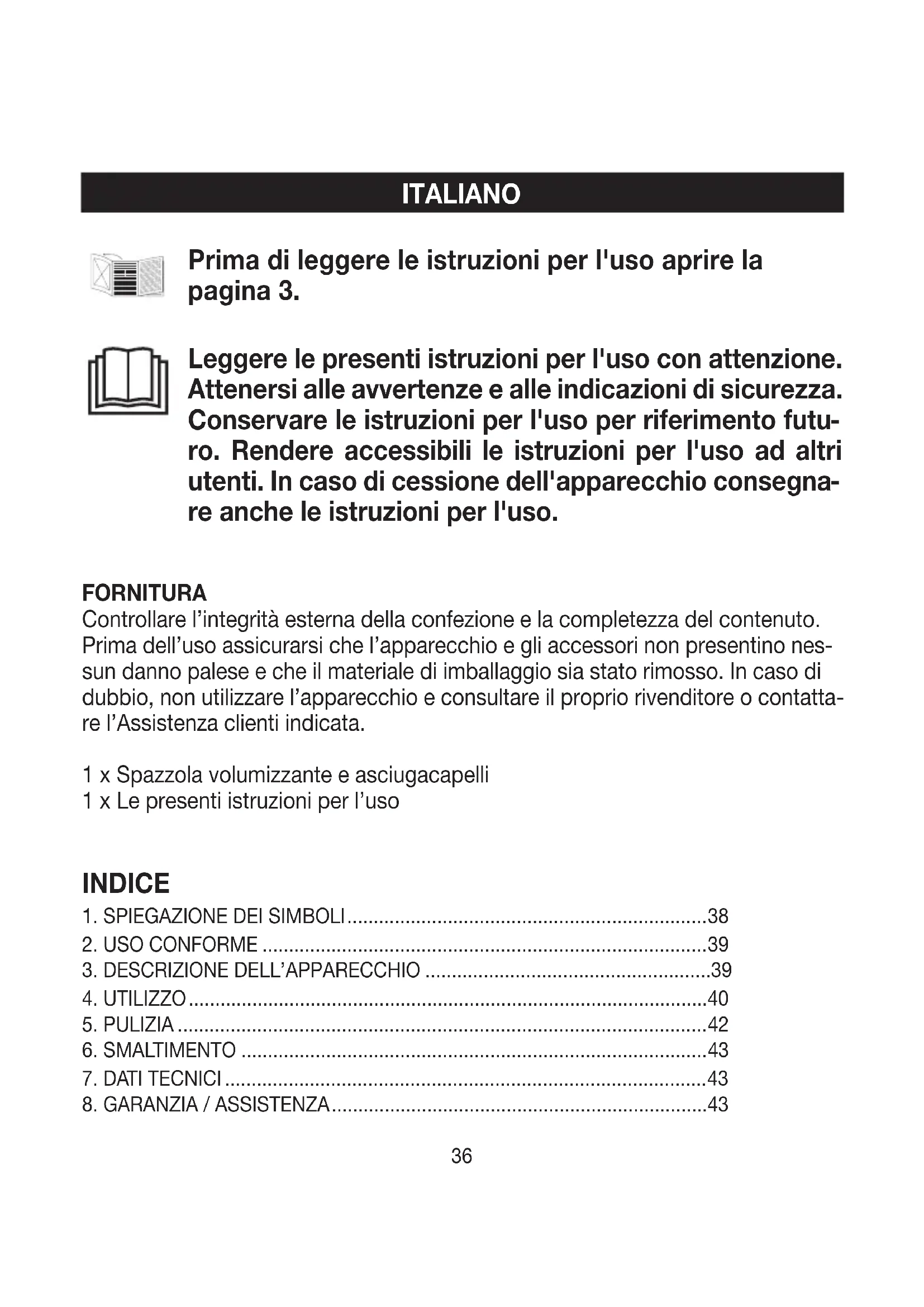 re anche le istruzioni per l'uso. Prima di leggere le istruzioni per l'uso aprire la pagina3. INDICE FORNITURA Controllare l’integrità esterna della confezione e la completezza del contenuto. Prima dell’uso assicurarsi che l’apparecchio e gli accessori non presentino nes- sun danno palese e che il materiale di imballaggio sia stato rimosso. In caso di dubbio, non utilizzare l’apparecchio e consultare il proprio rivenditore o contatta- re l’Assistenza clienti indicata. 1 x Spazzola volumizzante e asciugacapelli 1 x Le presenti istruzioni per l’uso