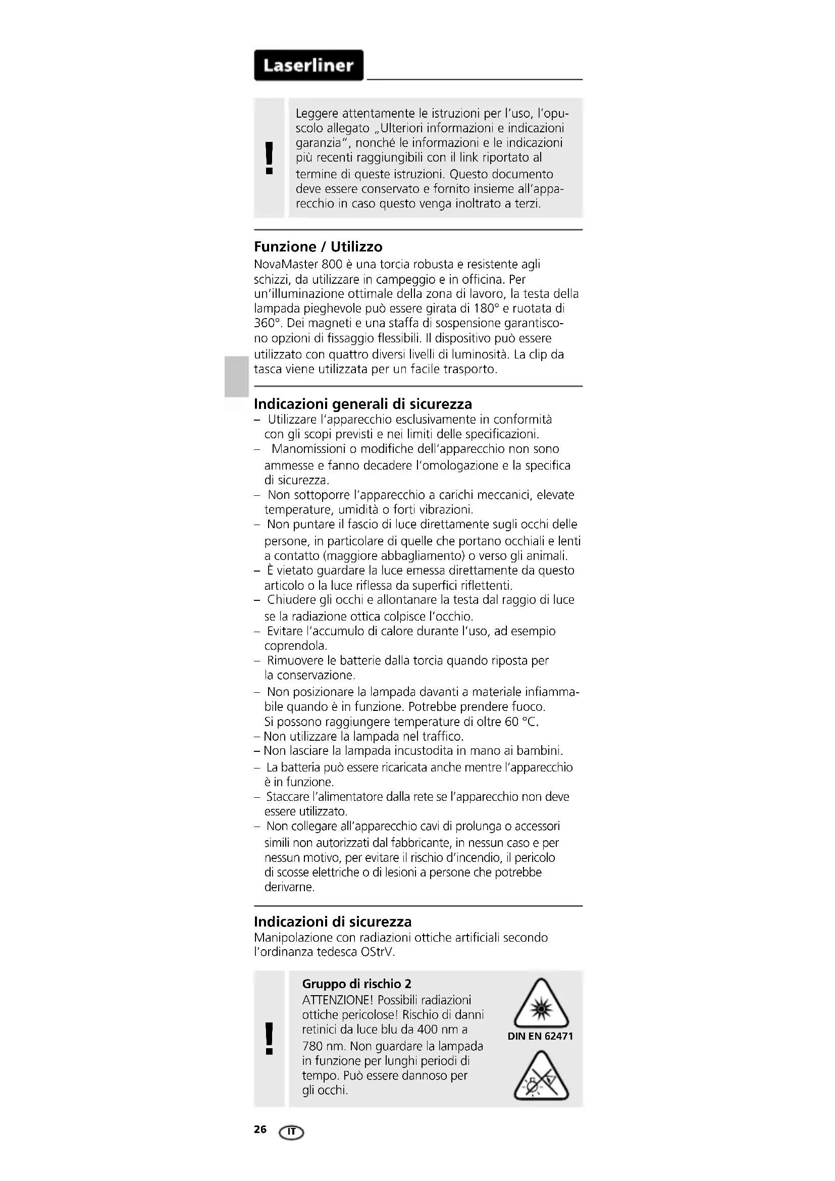 Indicazioni di sicurezza Manipolazione con radiazioni ottiche articiali secondo l’ordinanza tedesca OStrV. Indicazioni generali di sicurezza – Utilizzare l‘apparecchio esclusivamente in conformità con gli scopi previsti e nei limiti delle specificazioni. – Manomissioni o modifiche dell‘apparecchio non sono ammesse e fanno decadere l‘omologazione e la specifica di sicurezza. – Non sottoporre l‘apparecchio a carichi meccanici, elevate temperature, umidità o forti vibrazioni. – Non puntare il fascio di luce direttamente sugli occhi delle persone, in particolare di quelle che portano occhiali e lenti a contatto (maggiore abbagliamento) o verso gli animali. – È vietato guardare la luce emessa direttamente da questo articolo o la luce riessa da superci riettenti. – Chiudere gli occhi e allontanare la testa dal raggio di luce se la radiazione ottica colpisce l’occhio. – Evitare l’accumulo di calore durante l’uso, ad esempio coprendola. – Rimuovere le batterie dalla torcia quando riposta per la conservazione. – Non posizionare la lampada davanti a materiale inamma- bile quando è in funzione. Potrebbe prendere fuoco. Si possono raggiungere temperature di oltre 60 °C. – Non utilizzare la lampada nel trafco. – Non lasciare la lampada incustodita in mano ai bambini. – La batteria può essere ricaricata anche mentre l’apparecchio è in funzione. – Staccare l’alimentatore dalla rete se l’apparecchio non deve essere utilizzato. – Non collegare all’apparecchio cavi di prolunga o accessori simili non autorizzati dal fabbricante, in nessun caso e per nessun motivo, per evitare il rischio d’incendio, il pericolo di scosse elettriche o di lesioni a persone che potrebbe derivarne. Funzione / Utilizzo NovaMaster 800 è una torcia robusta e resistente agli schizzi, da utilizzare in campeggio e in ofcina. Per un’illuminazione ottimale della zona di lavoro, la testa della lampada pieghevole può essere girata di 180° e ruotata di 360°. Dei magneti e una staffa di sospensione garantisco- no opzioni di ssaggio essibili. Il dispositivo può essere utilizzato con quattro diversi livelli di luminosità. La clip da tasca viene utilizzata per un facile trasporto. Leggere attentamente le istruzioni per l‘uso, l’opu- scolo allegato „Ulteriori informazioni e indicazioni garanzia“, nonché le informazioni e le indicazioni più recenti raggiungibili con il link riportato al termine di queste istruzioni. Questo documento deve essere conservato e fornito insieme all‘appa- recchio in caso questo venga inoltrato a terzi.