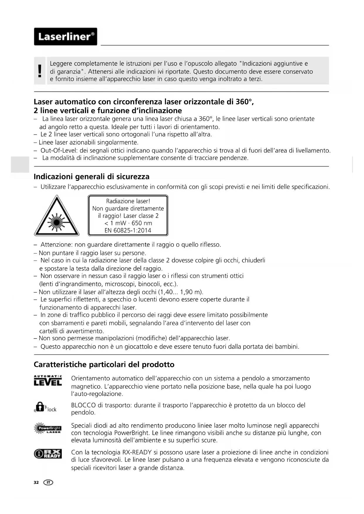 Laser automatico con circonferenza laser orizzontale di 360°, 2 linee verticali e funzione d‘inclinazione – La linea laser orizzontale genera una linea laser chiusa a 360°, le linee laser verticali sono orientate ad angolo retto a questa. Ideale per tutti i lavori di orientamento. – Le 2 linee laser verticali sono ortogonali l‘una rispetto all‘altra. – Linee laser azionabili singolarmente. – Out-Of-Level: dei segnali ottici indicano quando l‘apparecchio si trova al di fuori dell‘area di livellamento. – La modalità di inclinazione supplementare consente di tracciare pendenze. Indicazioni generali di sicurezza Radiazione laser! Non guardare direttamente il raggio! Laser classe 2 < 1 mW · 650 nm EN 60825-1:2014 – Attenzione: non guardare direttamente il raggio o quello riesso. – Non puntare il raggio laser su persone. – Nel caso in cui la radiazione laser della classe 2 dovesse colpire gli occhi, chiuderli e spostare la testa dalla direzione del raggio. – Non osservare in nessun caso il raggio laser o i riessi con strumenti ottici (lenti d‘ingrandimento, microscopi, binocoli, ecc.). – Non utilizzare il laser all‘altezza degli occhi (1,40... 1,90 m). – Le superci riettenti, a specchio o lucenti devono essere coperte durante il funzionamento di apparecchi laser. – In zone di trafco pubblico il percorso dei raggi deve essere limitato possibilmente con sbarramenti e pareti mobili, segnalando l‘area d‘intervento del laser con cartelli di avvertimento. – Non sono permesse manipolazioni (modiche) dell‘apparecchio laser. – Questo apparecchio non è un giocattolo e deve essere tenuto fuori dalla portata dei bambini. – Utilizzare l‘apparecchio esclusivamente in conformità con gli scopi previsti e nei limiti delle specicazioni.