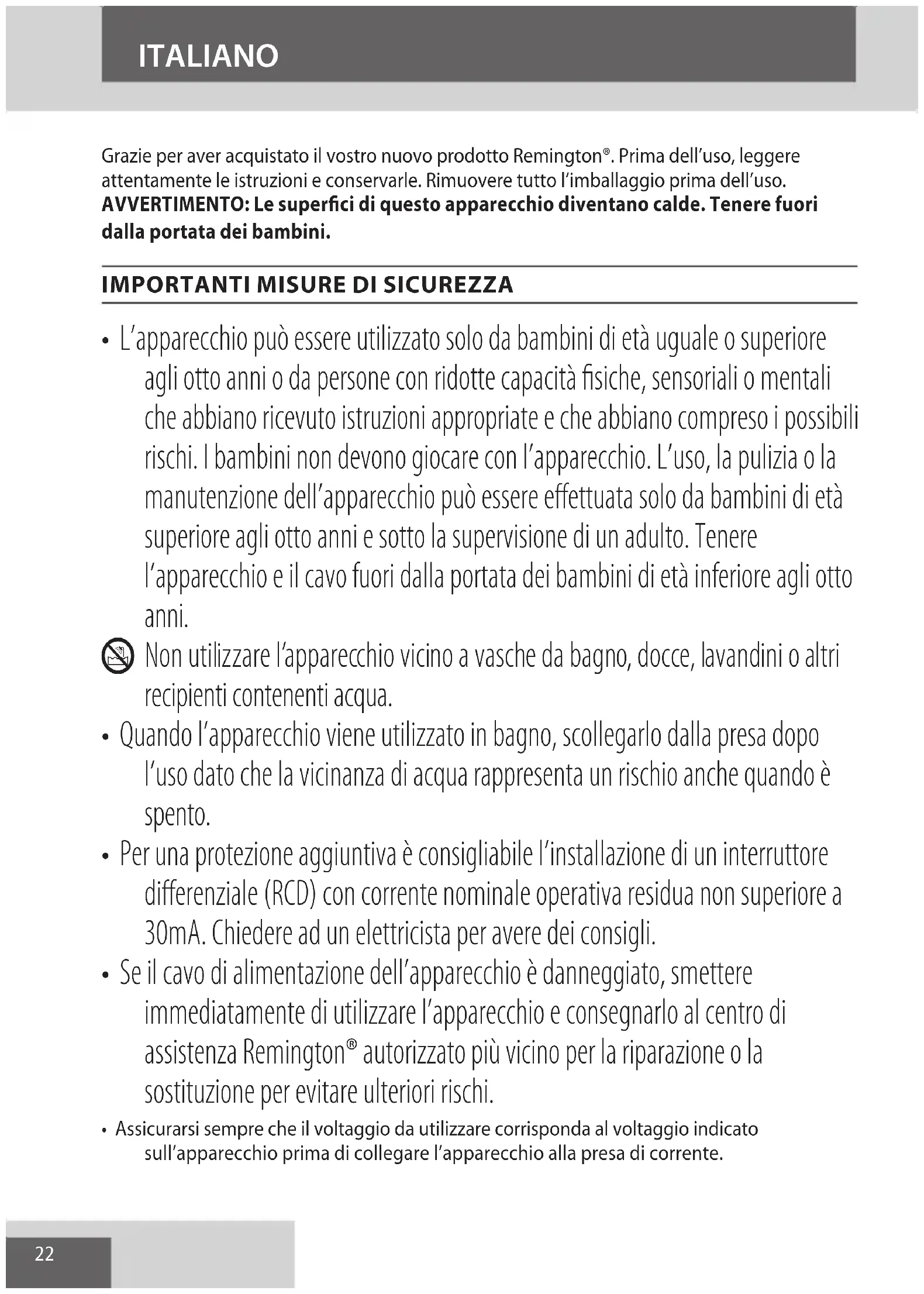AE22 Grazie per aver acquistato il vostro nuovo prodotto Remington®. Prima dell’uso, leggere attentamente le istruzioni e conservarle. Rimuovere tutto l’imballaggio prima dell’uso. AVVERTIMENTO: Le superfici di questo apparecchio diventano calde. Tenere fuori dalla portata dei bambini.