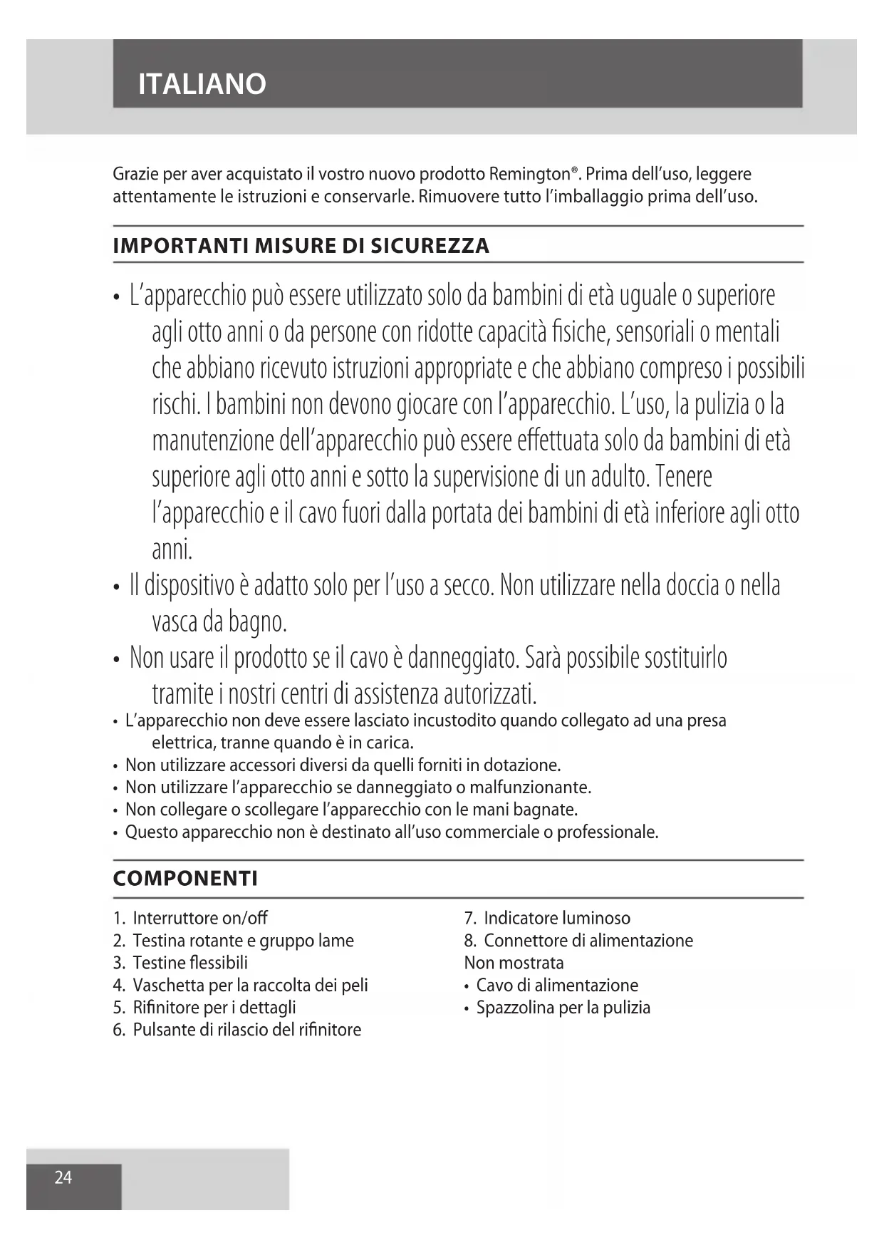 AE24 Grazie per aver acquistato il vostro nuovo prodotto Remington®. Prima dell’uso, leggere attentamente le istruzioni e conservarle. Rimuovere tutto l’imballaggio prima dell’uso.